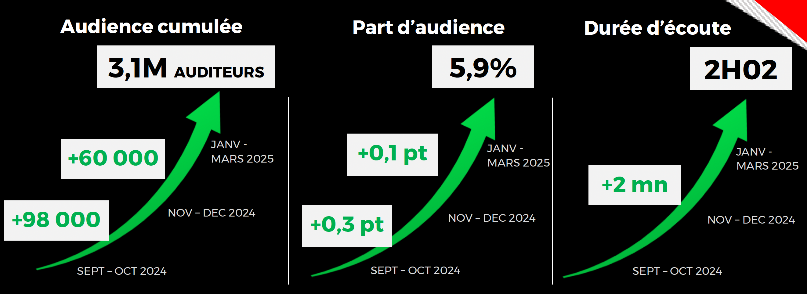 Sur la période janvier-mars 2025, RMC confirme une dynamique positive sur l’ensemble des indicateurs de la mesure EAR de Médiamétrie. La station progresse en audience cumulée, avec 60 000 auditeurs supplémentaires par rapport à la vague précédente mais en baisse sur un an. En part d’audience, elle enregistre une hausse de 0.3 point, atteignant 5.9%. La durée d’écoute progresse également, passant à 2h02, soit 2 minutes de plus qu’en novembre-décembre 2024.