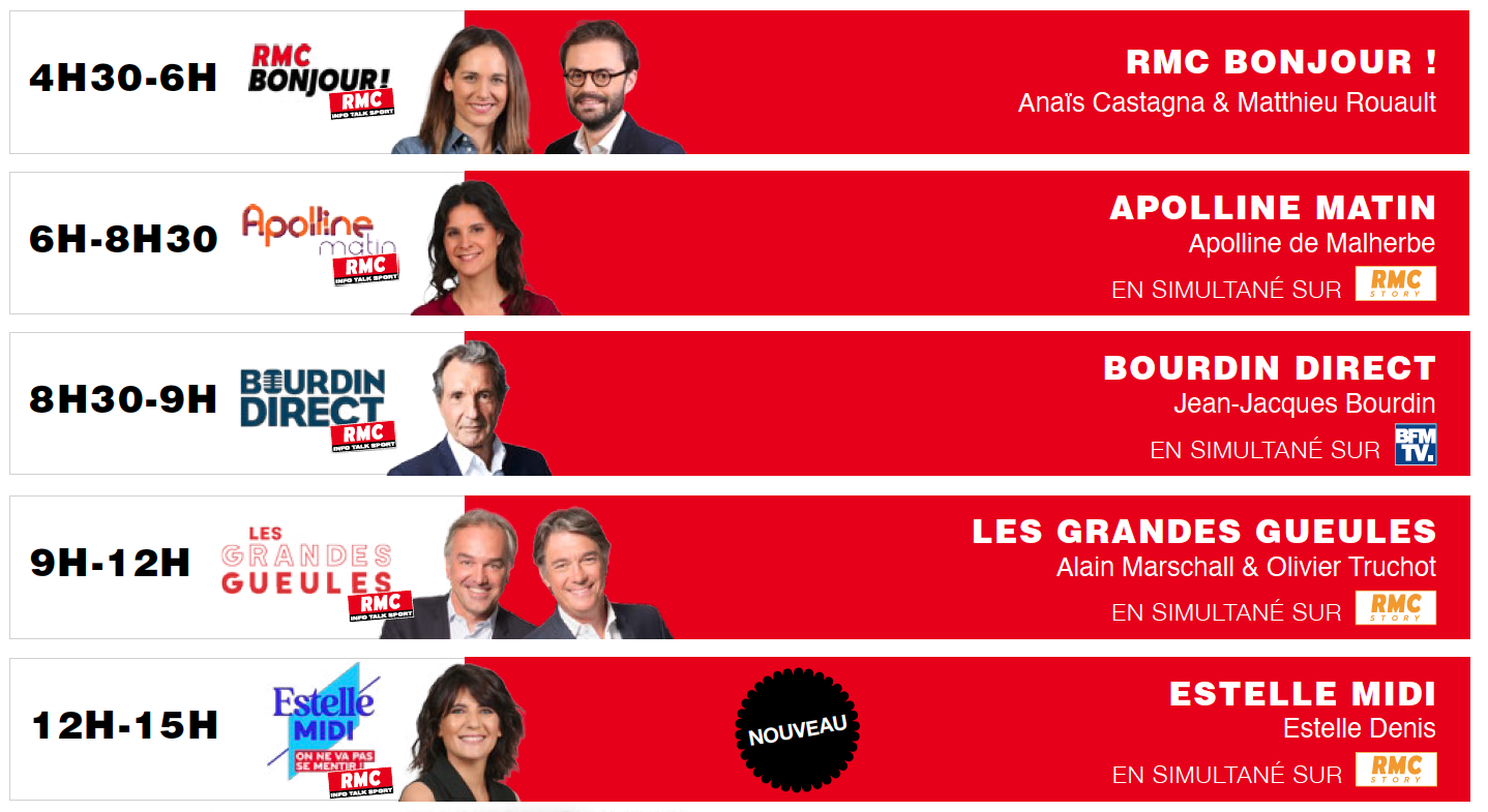 "Entourée de fortes têtes et de chroniqueurs déterminés à faire bouger les lignes, Apolline de Malherbe dirigera une matinale qui lui ressemblera : professionnalisme, conviction et empathie. Jean-Jacques Bourdin présentera son interview politique de 8h35, le rendez-vous incontournable de l’élection présidentielle. RMC, c’est aussi un forum de liberté ouvert à chacun. Alain Marschall et Olivier Truchot se sont entourés de nouvelles "Grandes Gueules" plus régionales, plus jeunes, plus impertinentes. À midi, Estelle Denis promet un rendez-vous où "On ne va pas se mentir". Tout est bon : politique, économie, santé mais aussi télévision pour nourrir des débats où la décontraction doit régner".