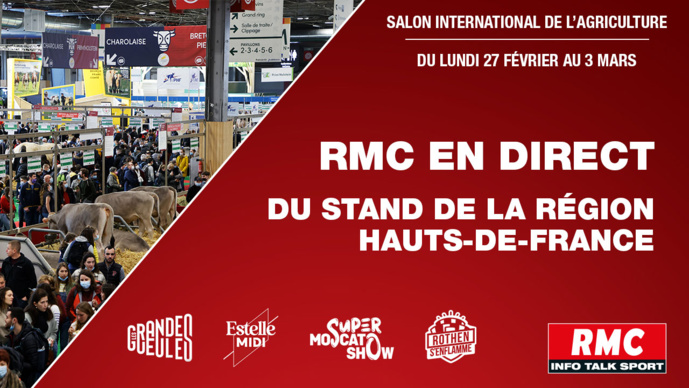 Le lundi, RMC sera en direct du Salon de l'agriculture de 09h à 20h avec quatre émissions délocalisées : "Les Grandes gueules" de 09h à midi, "Estelle Midi" de 12h à 15h, "Super Moscasto Show" de 15h à 18h et "Rothen, s'enflamme" de 18h à 20h. Le mardi, la radio y sera en direct de 15h à 20h. Le mercredi et le jeudi de 09h à 20h. Enfin, le vendredi de 09h à 15h.La station s'installera sur le stand de la Région Hauts-de-France dans le Pavillon 3 sur le stand J132.