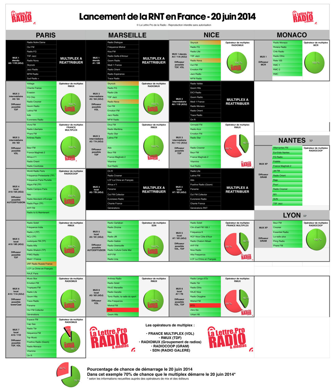 En dehors de la station RTS (zone rouge sur notre graphique) qui a rendu son autorisation et probablement 2RF (Radio Russie France) et Radio Nova qui devrait la rendre bientôt, toutes les stations des multiplex autorisés devraient démarrer rapidement dans les villes de Paris et de Marseille. Pour Nice, le démarrage semble toutefois plus compliqué pour juin. Il est vraisemblable que la plupart des multiplex ne démarrent pas avant septembre.