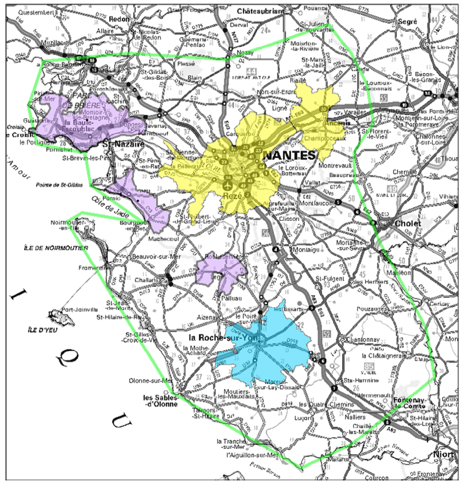 Contour des allotissements susceptibles d'être mis en appel (en vert, contour de l’allotissement étendu de Nantes, en jaune allotissements locaux de Nantes, en mauve allotissement local de Saint-Nazaire et en bleu allotissement local de La Roche-sur-Yon)