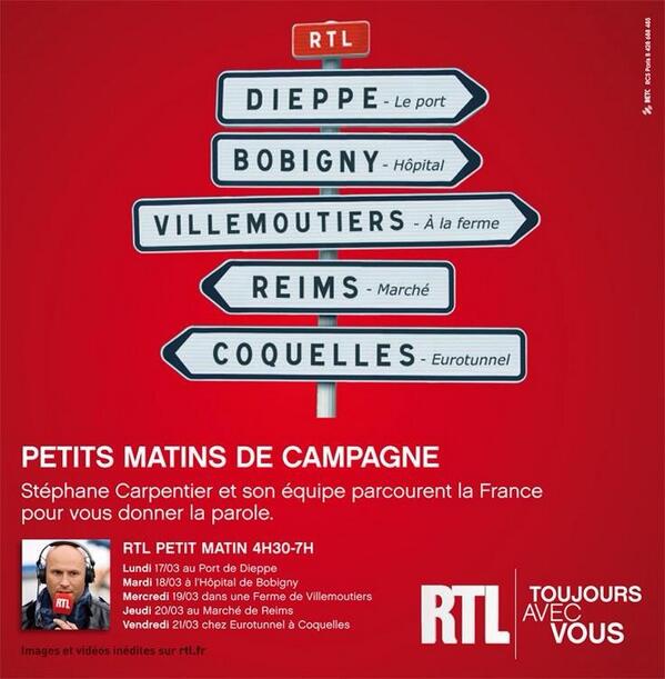 Du lundi 17 au vendredi 21 mars, de 4h30 à 7, "Petits Matins de Campagne", Stéphane Carpentier et l'équipe de RTL Petit Matin délocalisent leur session d'information dans cinq villes de France : ce lundi 17 mars, sur le port de Dieppe (76), ce mardi 18 mars avec les salariés de l'hôpital Avicenne de Bobigny (93), ce mercredi 19 mars dans une ferme de Villemoutiers, entre Montargis et Orléans (45), ce jeudi 20 mars, en direct d'un marché de Reims (51)
