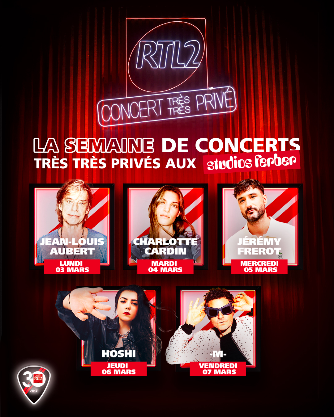 La programmation promet des noms incontournables de la scène pop-rock. Jean-Louis Aubert ouvrira le bal le lundi 3 mars. Le lendemain, Charlotte Cardin prendra le relais. Mercredi 5 mars, ce sera au tour de Jérémy Frérot d’investir la scène, avant une performance intense de Hoshi, le jeudi 6 mars. Enfin, -M- clôturera cette semaine, le vendredi 7 mars, marquant ainsi les 30 ans de RTL2 avec un show exclusif entouré de plusieurs invités surprises.