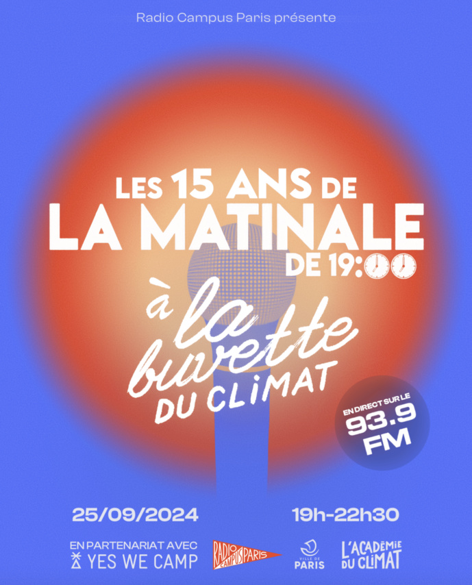 Les auditeurs pourront célébrer avec l'équipe de Radio Campus Paris les 15 ans de "La Matinale de 19 heures" à la Buvette de l'Académie du Climat. Au programme, des émissions spéciales et la "Fraîche Liste". L'accès sera libre et gratuit. Une occasion de "célébrer 15 ans de journalisme engagé, décalé, social et culturel avec l’émission phare de Radio Campus Paris".