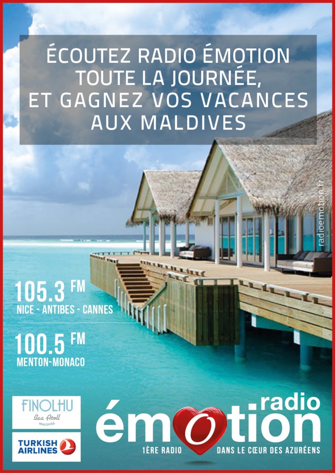 Radio Émotion s’occupe de tout : less billets d’avions au départ de Nice en vol Turkish Airlines, cinq nuits en demi-pension au Finolhu Baa Atoll, un hôtel de luxe 5 étoiles composé de villas luxueuses sur pilotis avec une vue idyllique sur un récif privé ainsi que les transferts depuis l’aéroport. Pour gagner ces vacances ensoleillées à deux personnes aux Maldives, il suffit simplement d'écouter Radio Émotion cette semaine, àout moment de la journée.