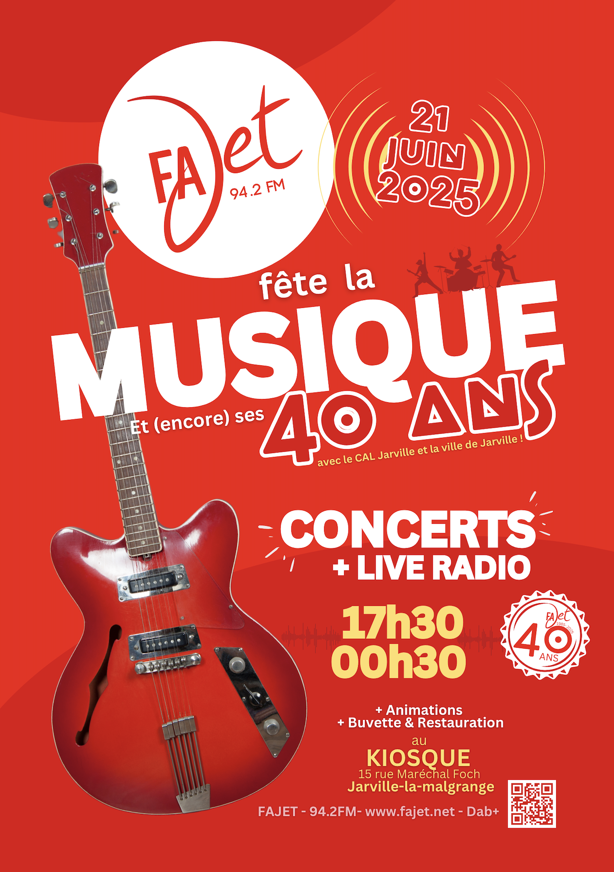 Le 21 juin prochain, Radio Fajet fêtera ses 40 ans d’antenne à l’occasion de la Fête de la Musique. Une programmation musicale 100 % locale et éclectique accompagnera cet anniversaire au kiosque de Jarville-la-Malgrange, de 17h30 à 00h30. Ce moment festif sera retransmis en direct sur les ondes de la station.