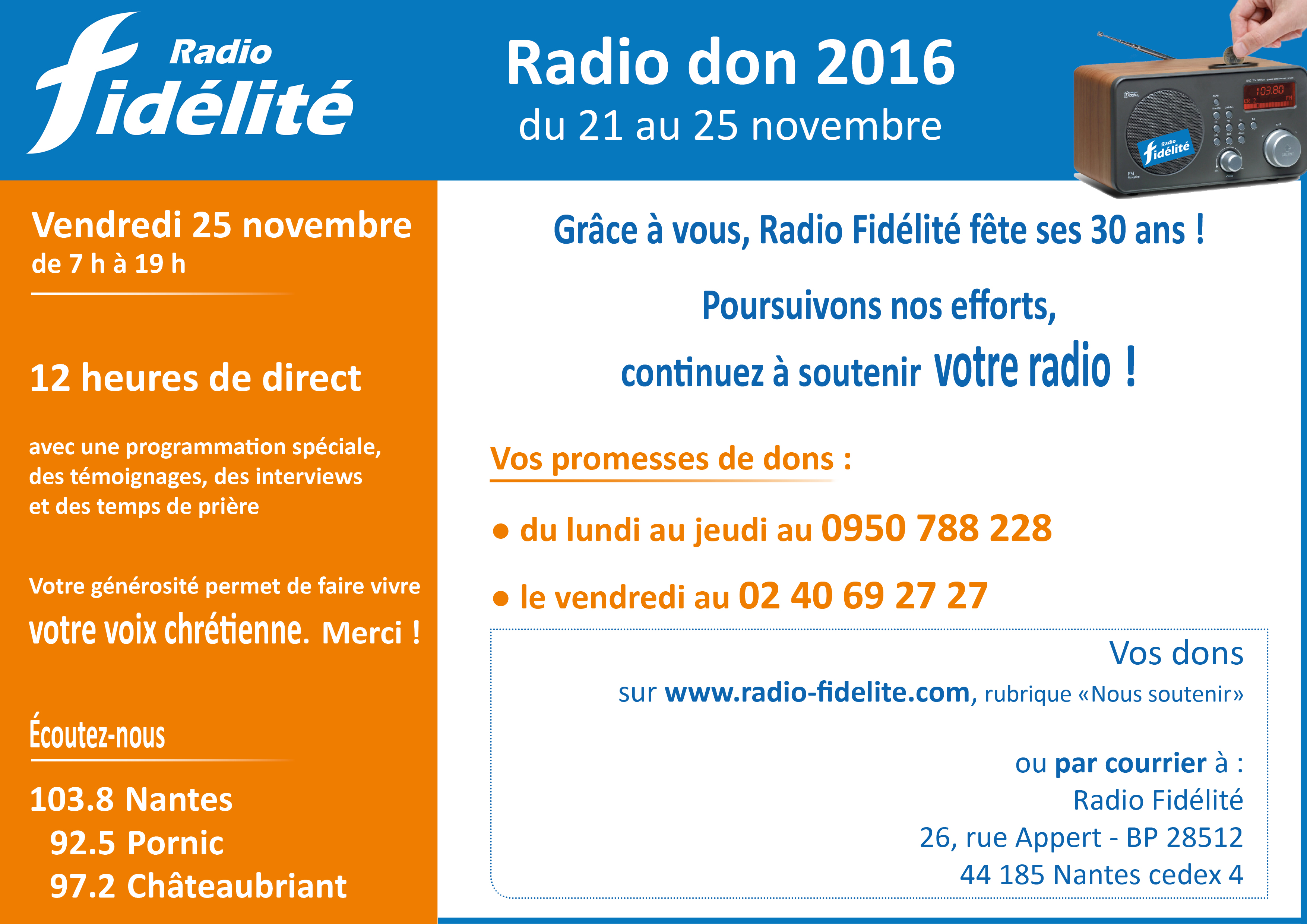 Depuis 30 ans, Radio Fidélité émet sur trois fréquences (sur 103.8 à Nantes, sur 92.5 à Pornic et sur 97.2 à Châteaubriant) grâce à la générosité de ses donateurs. Toute la semaine, Radio Fidélité sensibilise ses auditeurs à la nécessité de continuer à soutenir financièrement la radio pour continuer à être un média de proximité, porteuse de sens et d’espérance. Les promesses de dons se feront en temps réel au 02 40 69 27 27. Les dons pourront également être réalisés directement sur radio-fidelite.com ou par courrier (au 26, rue Nicolas Appert – BP 28512 – 44185 Nantes cedex 4).