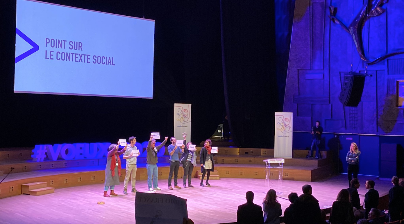"Certains salariés montent sur scène avec panneaux et vuvuzella" pouvait-on lire sur le compte Twitter du syndicat SNJ Radio France. Le personnel présent a également scandé "Sibyle, ton plan on n’en veut pas" suivi d’une chanson "On a tous un métier qui nous plait". "Quand on change de PDG tous les trois ans et de DRH tous les ans, personne n’a d’expérience de la Maison et la direction commet donc ce genre d’erreur : monter sur scène en plein conflit social, quand on n’a pas donné de ses nouvelles depuis trois semaines. Quelle bonne idée !" s'est félicité le même syndicat.