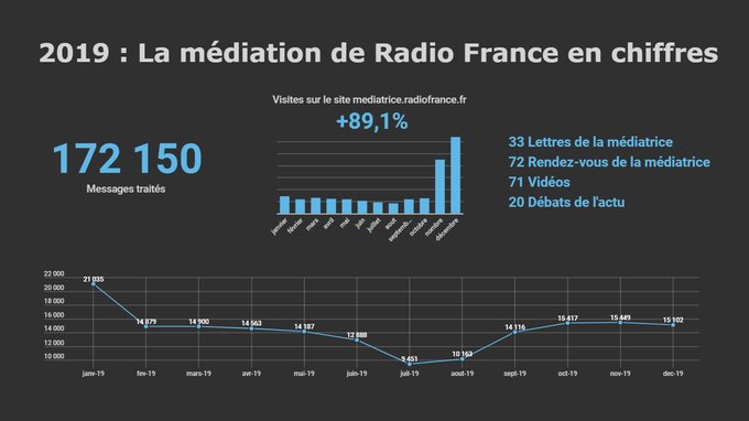 Le service de la médiation de Radio France a publié le bilan de son activité en 2019. La médiatrice Emmanuelle Daviet et son équipe ont reçu plus de 172 000 messages durant l'année, message en rapport avec les 7 chaînes du groupe Radio France (France Inter, franceinfo, France Bleu, France Culture, France Musique, FIP et Mouv'). Espace de dialogue des auditeurs des radios de Radio France, le site (ICI) a enregistré une fréquentation en hausse de 89.1% durant l'année 2019. 172 150 messages ont été traités. La médiatrice est intervenue 72 fois lors de rendez-vous réguliers sur les radios et a produit 33 lettres et 20 débats autour de l'actualité.