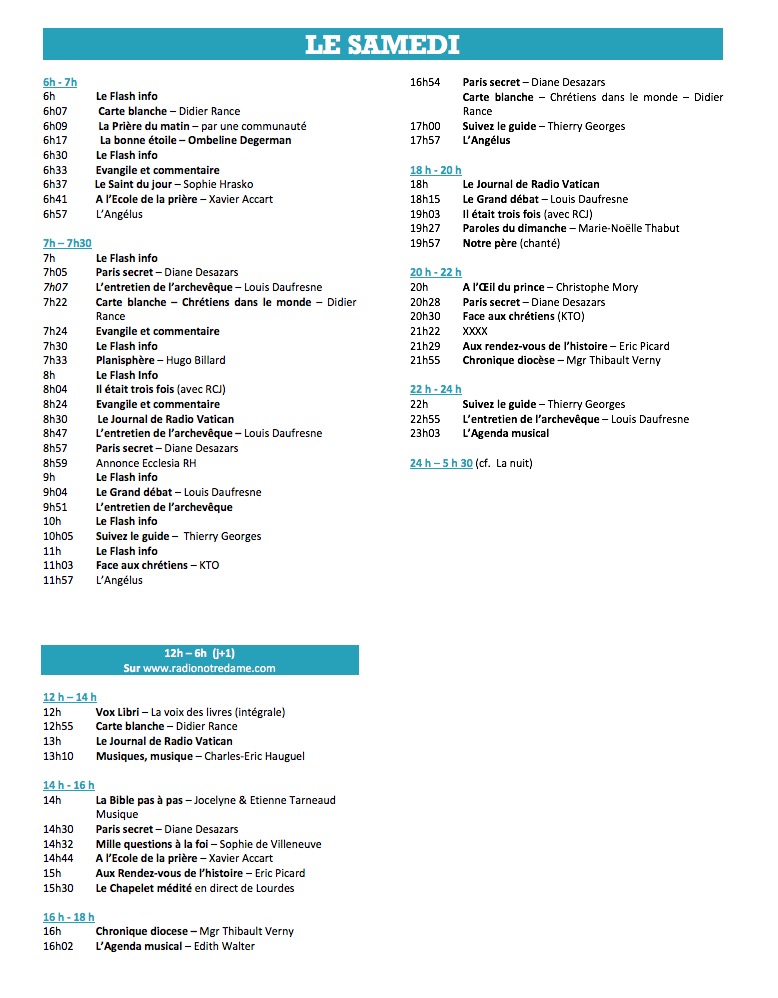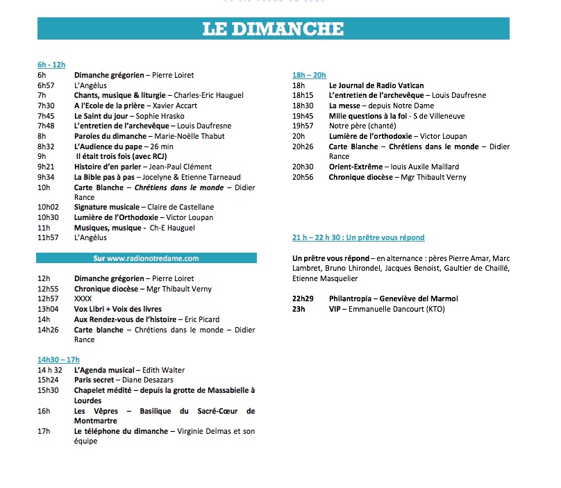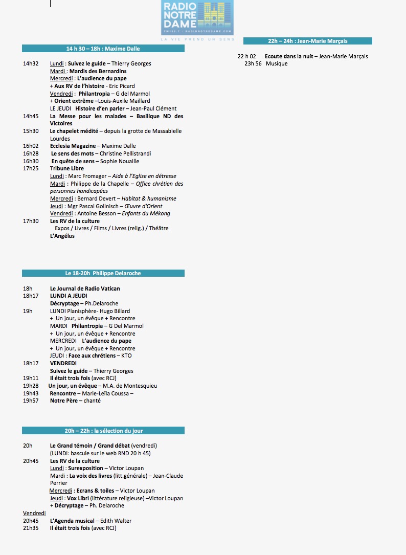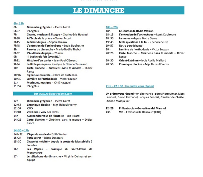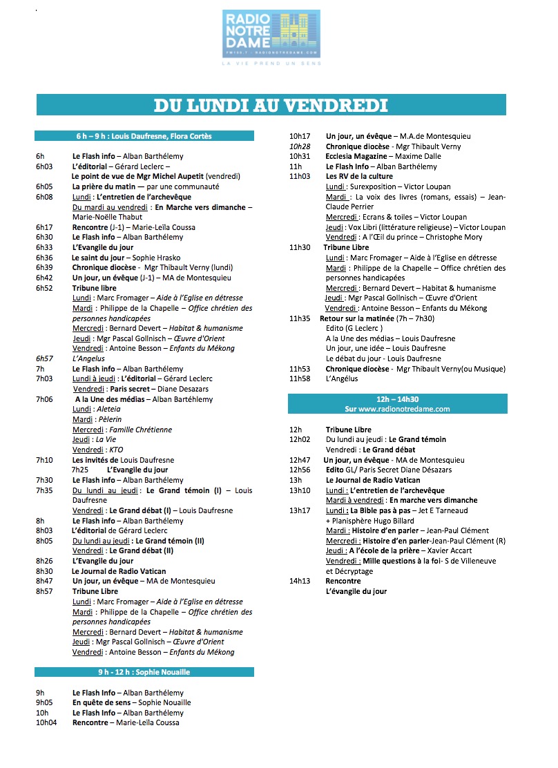 Pour cette rentrée, Monseigneur Michel Aupetit, le nouvel archevêque de Paris prendra la parole toutes les semaines au cours de "L'entretien de l’archevêque" (samedi 8h47, 9h51 et 22h55 ainsi que le dimanche 7h48 et 18h45). L'émission "En quête de sens" donnera priorité aux témoignages : Sophie Nouaille donnera du sens chaque matin à 9h00, rendez-vous quotidien où sont abordés tous sujets de société famille, santé, travail, environnement, consommation… Et bien sûr, Radio Notre Dame s’écoute sur tous les supports, et accompagne ses auditeurs sur les réseaux sociaux et propose une écoute prolongée grâce à ses podcasts.
