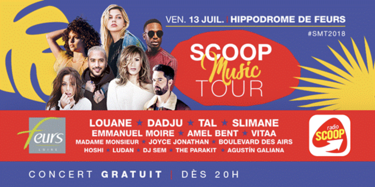 Le Scoop Music Tour est un événement gratuit et ouvert à tous, à vivre en famille ou entre amis. Les plus chanceux peuvent dès à présent gagner leur Pass VIP pour le concert sur la page Facebook Loire - Haute Loire et la page Facebook Lyon de Radio Scoop. Le concert sera d’ailleurs à suivre en live sur les réseaux sociaux et le site de la radio, le 13 juillet, dès 20h.