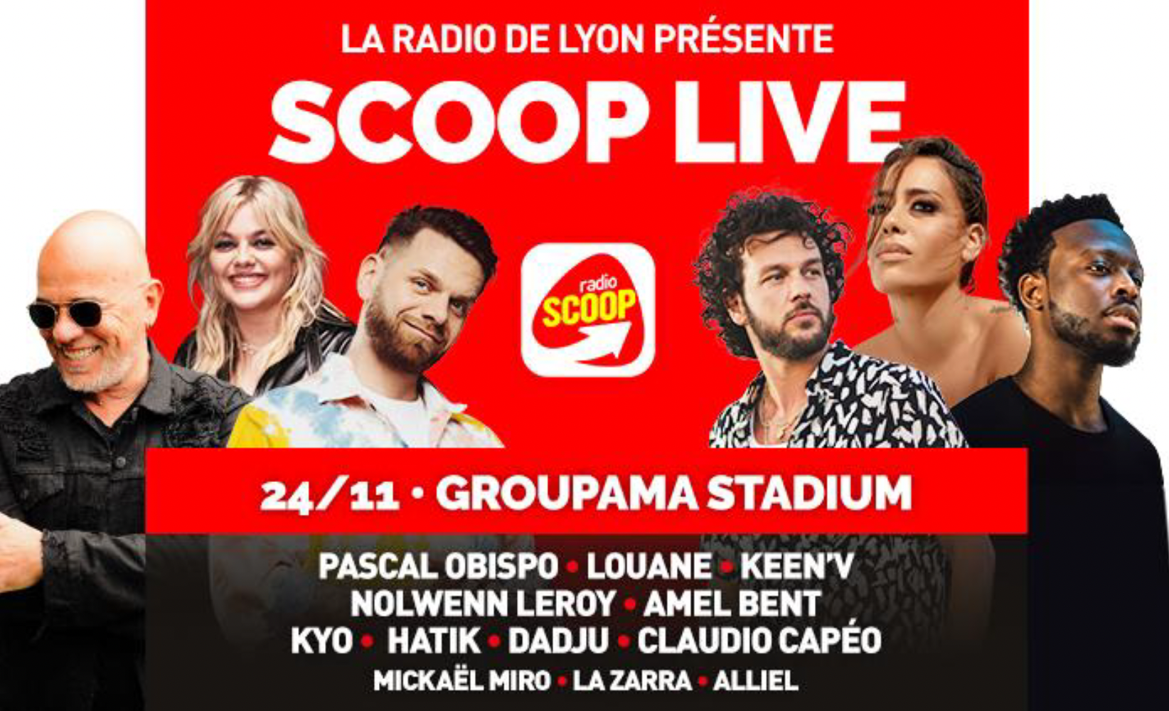 Une fois de plus, Radio Scoop frappe fort en organisant ce mercredi 24 novembre, l’événement musical de l’automne, le "Scoop Live" dans le but d'offrir à ses auditeurs un concert de plus de deux heures au Groupama Stadium en invitant 12 artistes français. Pascal Obispo, Louane, Keen’v, Nolwenn Leroy, Amel Bent, Kyo, Hatik, Dadju, Claudio Capéo, Mickaël Miro, La Zarra et Alliel seront présents et préparent un show unique.