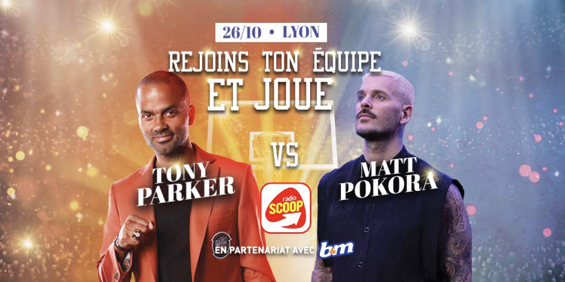 Les auditeurs ont été invités à jouer sur les antennes de Radio Scoop pour assister à cette rencontre. Sur place, un tirage au sort sera effectué. Les gagnants auront la chance de rejoindre l’équipe de leur star préférée, déjà composée d’amateurs et professionnels de différents clubs partenaires de Radio Scoop.Au programme : match de basket, concours de lancer franc et des animations surprises. L’éveénement se terminera par une interview des deux personnalités puis par un Showcase de Matt Pokora.