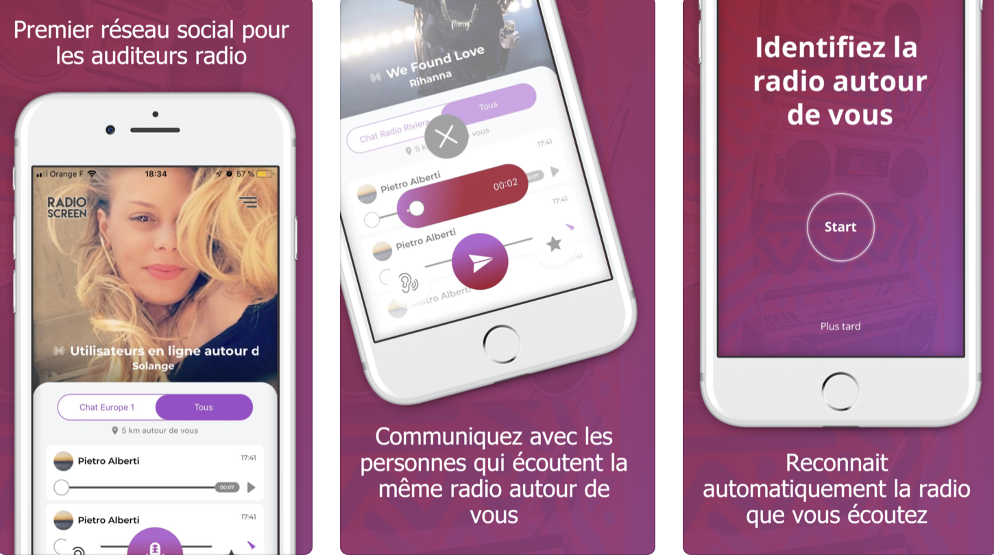 Radio Screen se présente comme "le premier réseau social pour les auditeurs radio où chaque utilisateur peut commenter ses émissions préférées, mais encore se renseigner sur le trafic routier auprès de la communauté et se faire de nouveaux amis".