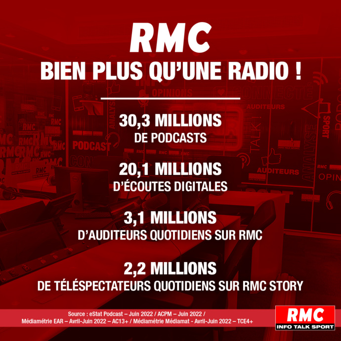 Cette saison, RMC pulvérise ses audiences podcasts avec en moyenne 28.8 millions d’écoutes chaque mois, soit une hausse de 58% par rapport à l’année dernière. Ces résultats confirment sa place de 2e radio privée de France en podcasts et positionnent 4 de ses émissions dans le Top 15. Et avec Avec 21,1 millions d’écoutes digitales en moyenne sur la saison (+ 14% en un an), RMC se positionne première radio privée de France.