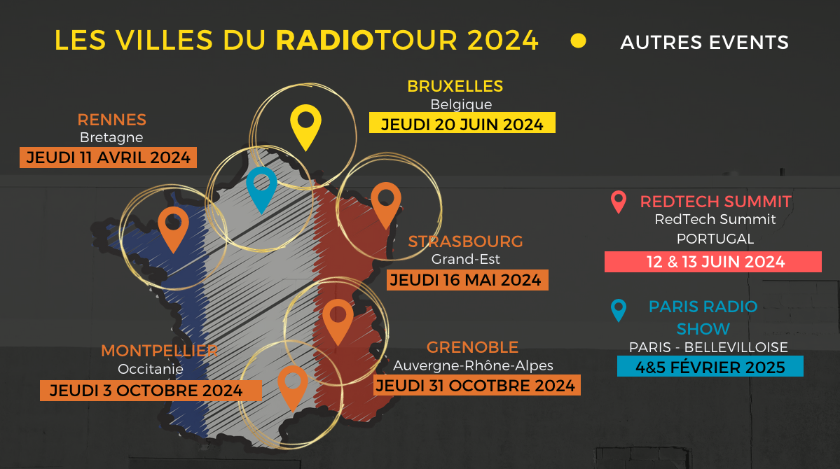 Le RadioTour se poursuivra donc en 2024 avec de nouvelles villes étapes. Dans chacune de ces villes, ces différentes étapes du RadioTour permettront de rassembler durant une journée les acteurs régionaux de la radio et de l'audio digital et de proposer, gratuitement, des conférences et des tables rondes.