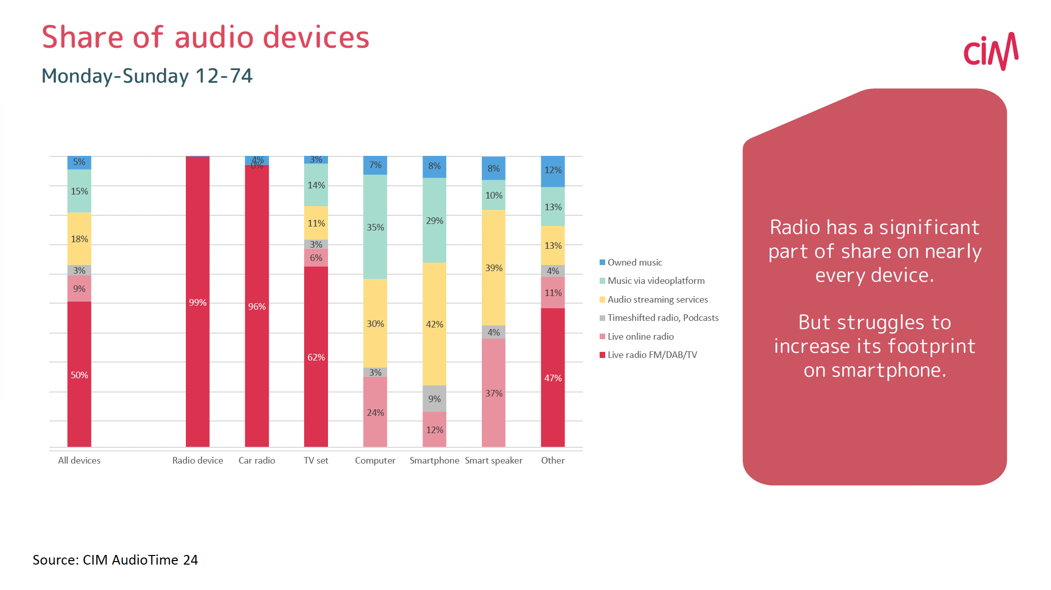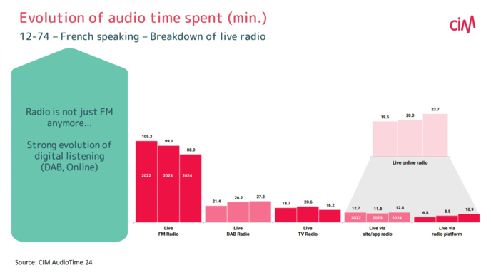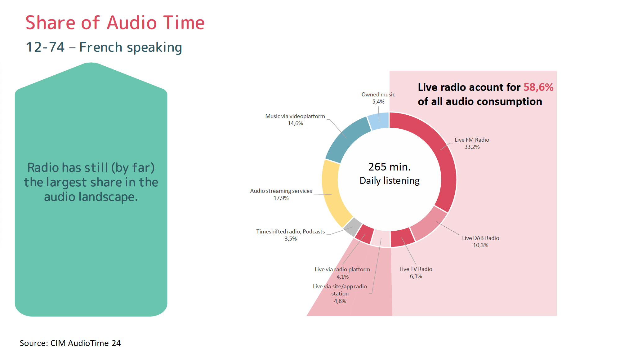 En Belgique, la radio connaît également une forte évolution de l'écoute numérique, en DAB et en ligne). Elle occupe toujours (et de loin) la plus grande place dans le paysage audio. La radio en direct représente 58,6% de la consommation audio totale. Elle domine très largement sur presque tous les appareils avec néanmoins quelques difficultés pour augmenter son empreinte sur les smartphones.