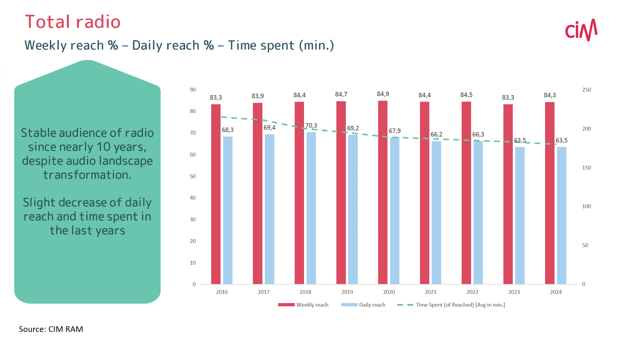 Face aux assauts de la concurrence, le média radio se porte bien en Belgique. Sur les dix dernières années, le Centre d’information sur les médias (CIM) constate une stabilité des audiences et de la durée d’écoute, tandis que la radio poursuit, avec succès, sa transition numérique. Un constat : les Belges aiment la radio : le média atteint 80% de la population des plus de 12 ans entre 13 et 2023. Depuis, plusieurs mois, trois stations se partagent les trois premières places : Radio Contact, Nostalgie et VivaCité.