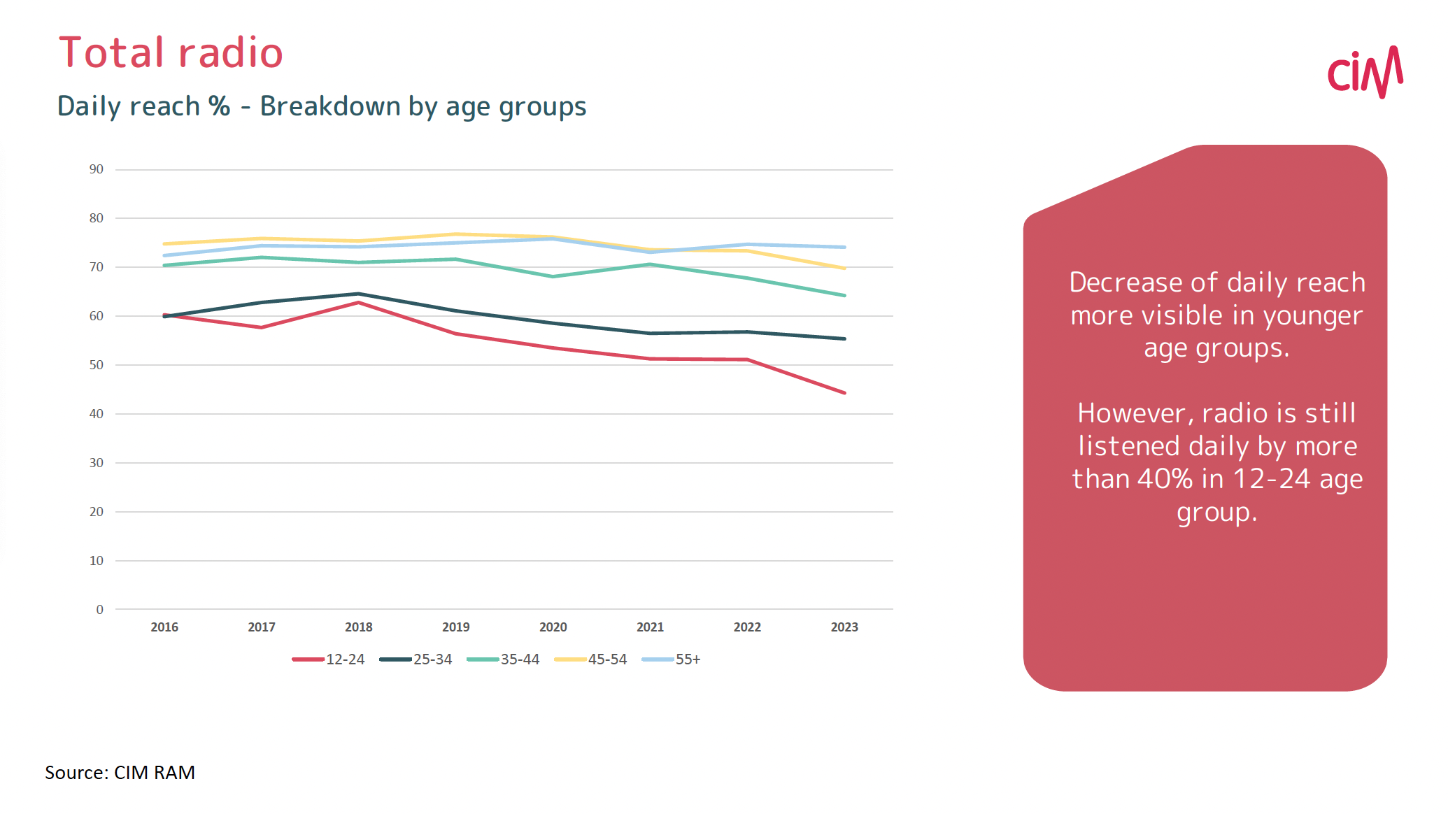 Autre enseignement, et malgré la transformation rapide du paysage, la diminution de la portée quotidienne est plus visible chez les plus jeunes. Cependant, la radio belge est toujours écoutée quotidiennement par plus de 40% des 12-24 ans.