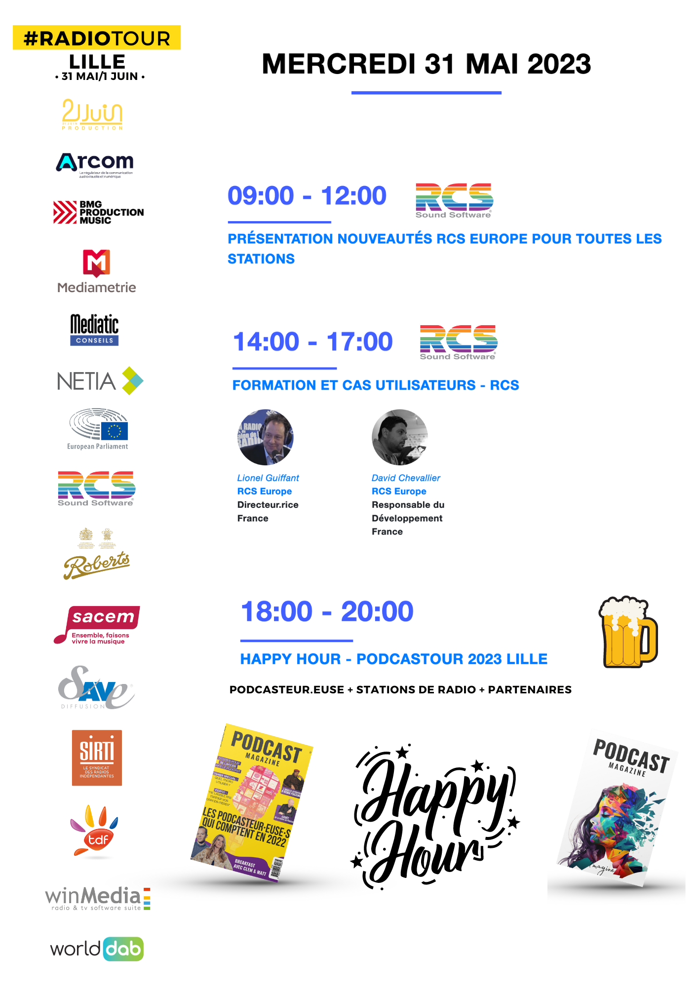 Cette année, cet événement s'arrête dans 5 villes de France : Lyon, Nantes, Lille, Toulouse et Marseille. Ces différentes étapes du RadioTour permettent de rassembler durant une journée les acteurs régionaux de la radio et de l'audio digital et de proposer des conférences et des tables rondes. À Lille, la veille, le Mercure Centre Vieux-Lille accueillera une journée de formation proposée par l'équipe de RCS Europe à 09h ainsi qu'un PodcasTour à 18h qui rassemblera les podcasteurs de Lille et de la région.