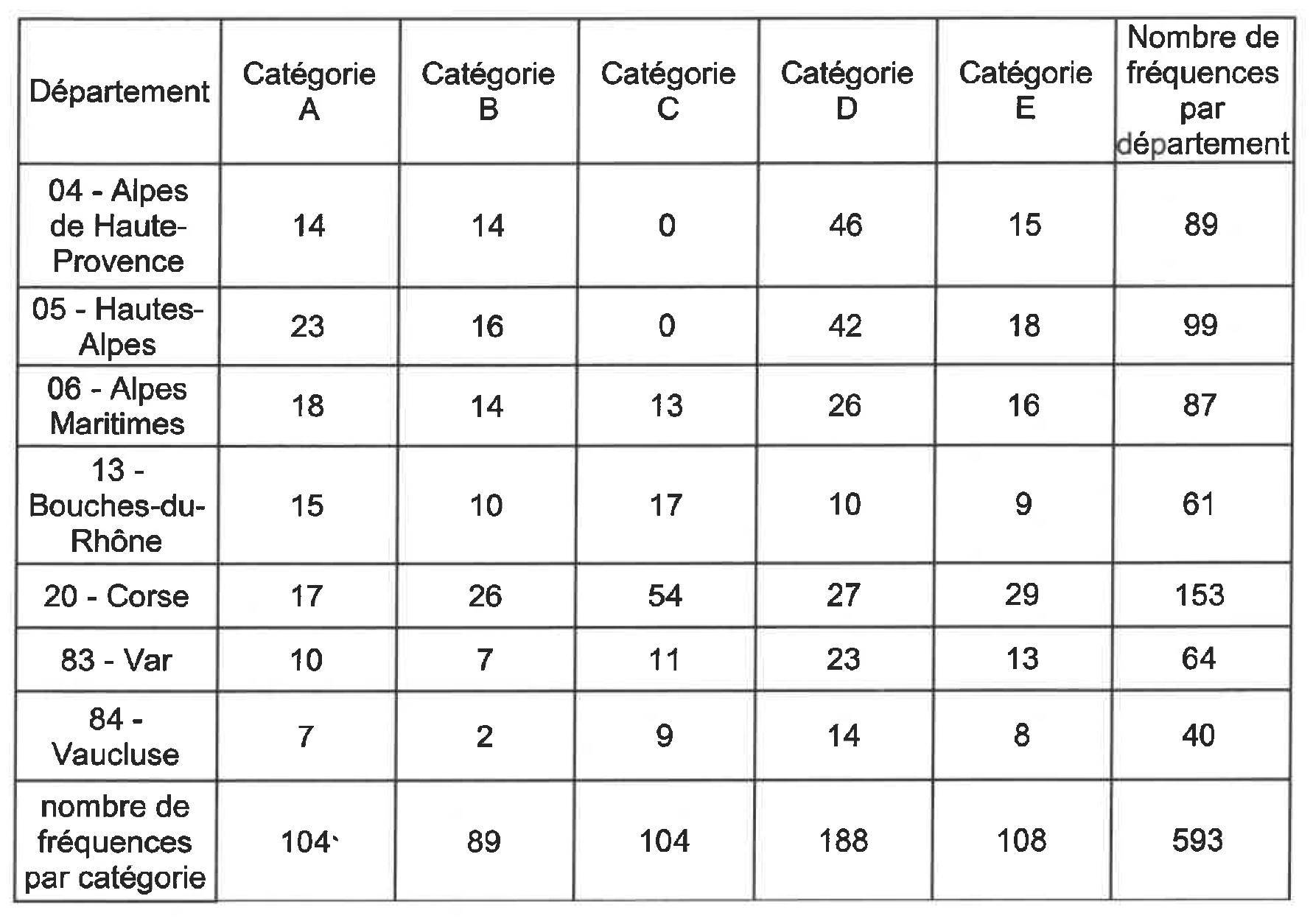 La Corse dispose de 153 fréquences FM. Suivent les Hautes-Alpes (99), les Alpes-de-Hautes-Provence (89), les Alpes-Maritimes (87), le Var (64), les Bouches-du-Rhône (61) et le département du Vaucluse (64 fréquences FM).