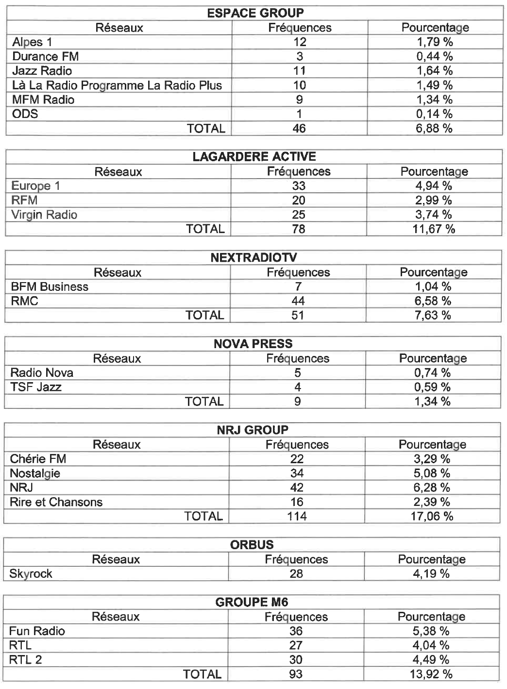 Autres chiffres intéressants, le nombre de fréquences par groupes et par réseaux. Dans l'ordre, NRJ Group (114 fréquences), Groupe M6 (93 fréquences), Lagardère (78 fréquences), NextRadioTV (51 fréquences), Espace Group (46 fréquences), Orbus (28 fréquences) et Nova Press (9 fréquences).