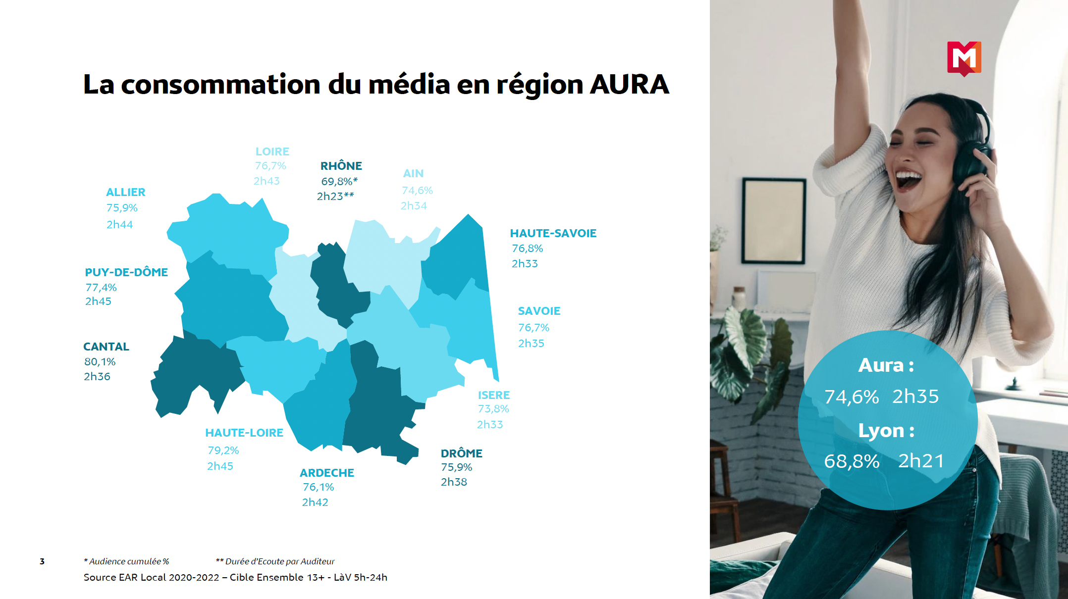 Un rappel d'abord : en France la radio réalise une audience cumulée de 72.9% pour une DEA de 2h39. En Auvergne-Rhône-Alpes, cette audience monte à 74.6% pour une DEA de 2h35. Deux départements se distinguent particulièrement : le Cantal (80.1% et 2h36) ainsi que la Drôme (75.9% et 2h38). À Lyon, l'audience cumulée est de 68.8% et la DEA est de 2h21.