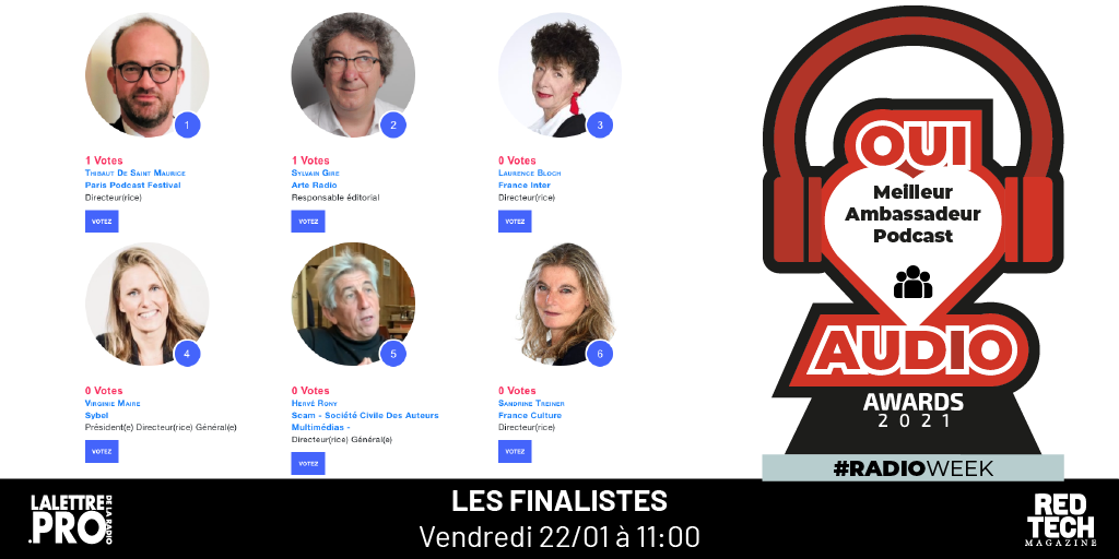 Les nominés pour le OUI❤️AUDIO AWARD - Ambassadeur Podcast de l'année sont Thibaut de Saint-Maurice (Paris Podcast Festival), Sylvain Gire (ARTE Radio), Laurence Bloch (France Inter), Virginie Maire (Sybel), Hervé Rony (Scam), Sandrine Treiner (France Culture). Pour voter, c'est ICI.