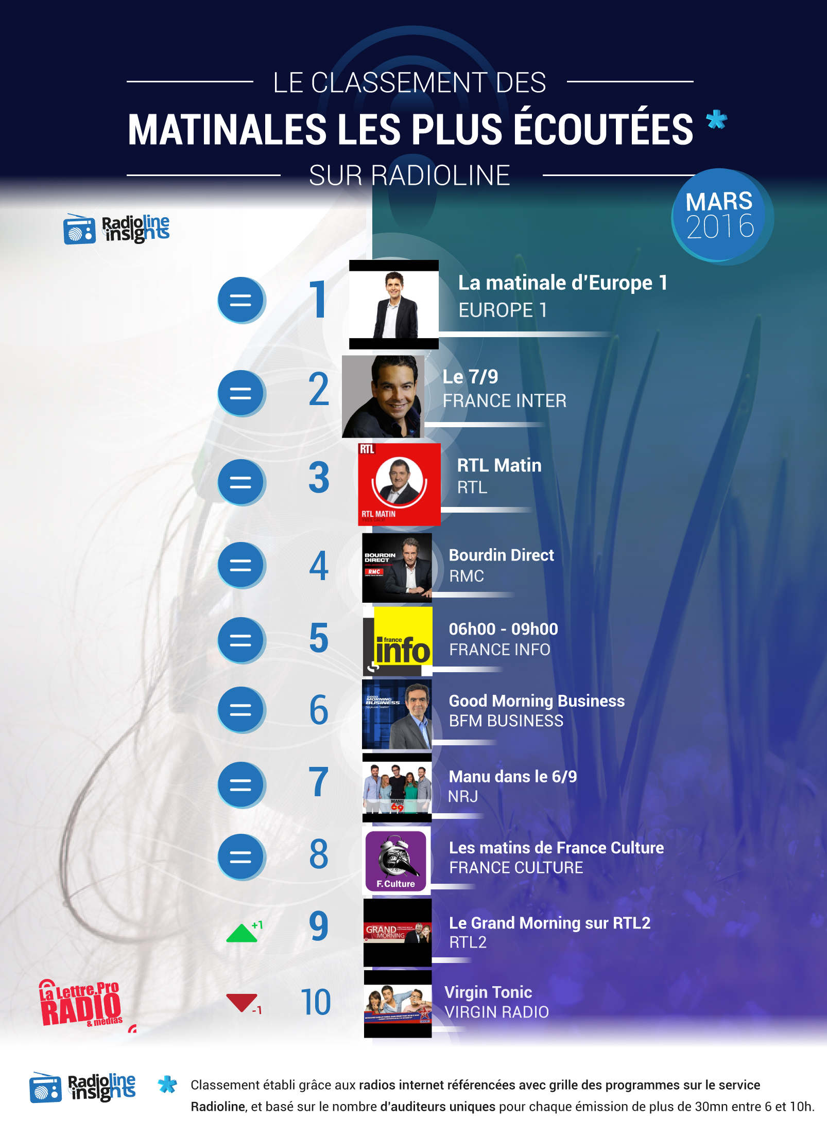 Le service de radios en ligne Radioline dévoile le classement des matinales du mois de mars 2016. Les habitudes n’ont pas changé ce mois-ci, puisque qu’ Europe 1 reste en tête avec la matinale de Thomas Sotto devant le 7/9 de France Inter et RTL Matin. Seul changement ce mois-ci, Le Grand Morning sur RTL2 repasse devant Virgin Tonic.Brulhatour est le rédacteur en chef du magazine La Lettre Pro de la Radio et le directeur associé... En savoir plus sur cet auteur