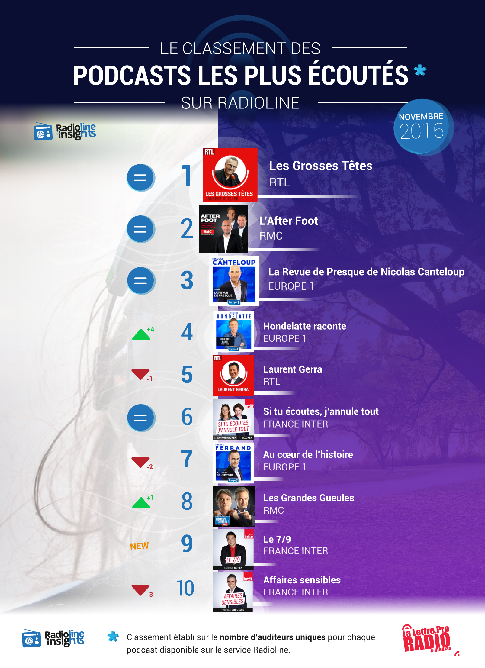 Si le podium des podcasts les plus écoutés sur Radioline reste inchangé ce mois-ci, Hondelatte raconte, sur Europe 1, marque les esprits en gagnant quatre places d'un coup et accède ainsi à la quatrième place de ce classement. Au détriment, entre autres d'Au cœur de l'histoire, sur Europe 1 aussi, qui perd deux places. Le 7/9 de France Inter entre à son tour dans ce classement à la neuvième place. La matinale ne se contente plus d'être uniquement la seconde la plus écoutée du service de Radioline en direct mais gagne aussi des auditeurs en réécoute. Pourtant, cela se fait au détriment d'un autre programme populaire de la station, Affaire sensible, qui régresse à la dixième place et en perd trois.