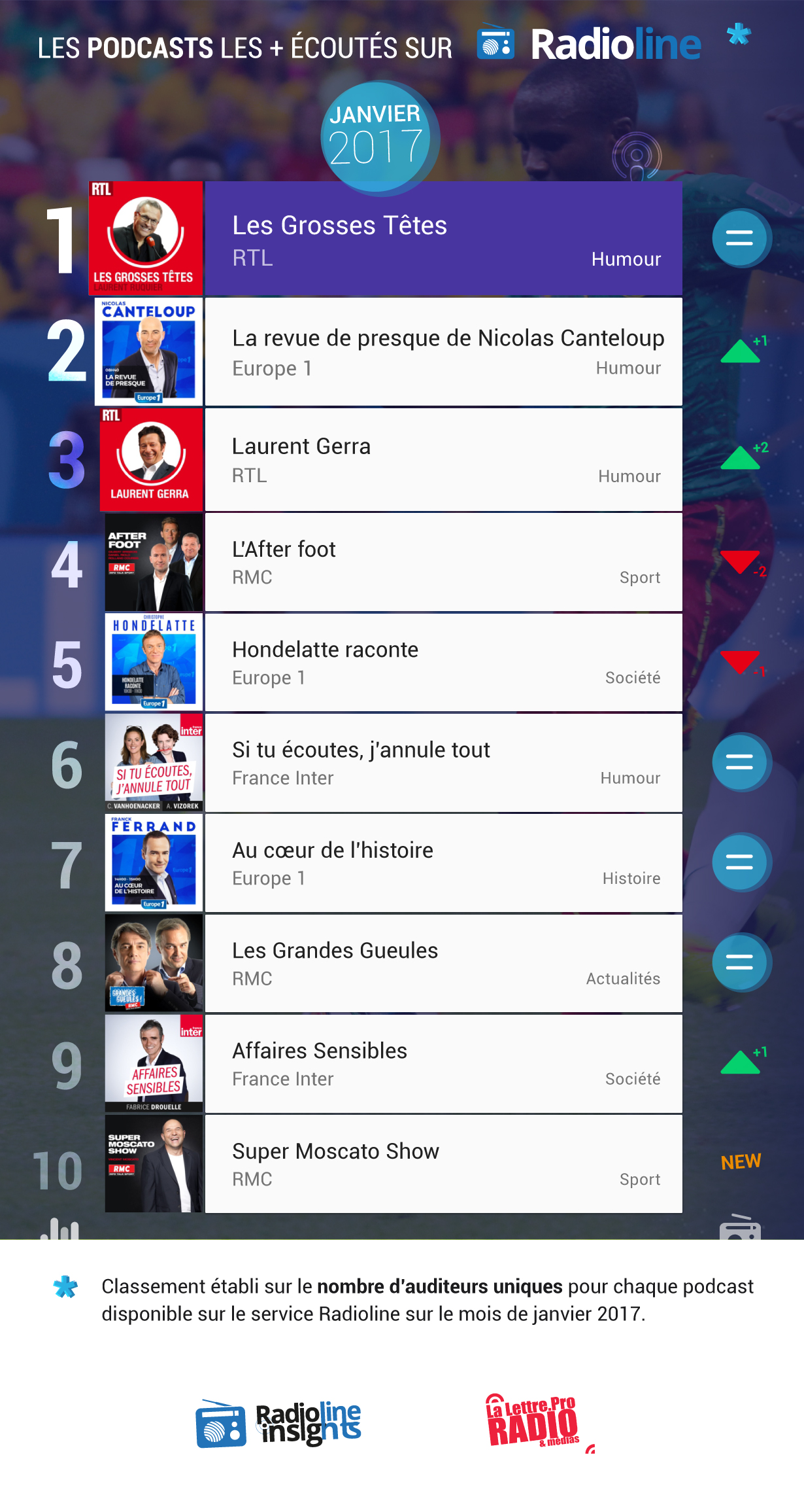 Si les Grosses Têtes de RTL imposent leur humour aux auditeurs de Radioline, Nicolas Canteloup sur Europe 1 les talonne à la seconde place suivi ensuite par Laurent Gerra sur RTL. Les deux imitateurs rejoignent la tête de ce classement et marquent une hégémonie des podcasts d'humour sur Radioline. L'After foot de RMC perd des plumes et chute à la quatrième place. Les quatre grandes radios généralistes se battent pour occuper le plus de places de ce top10. Sur ce terrain, c'est Europe 1 qui gagne avec 3 podcasts suivi de RMC avec 3 podcasts aussi mais moins bien classés.