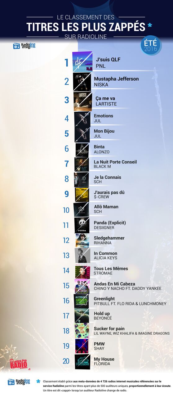 Il y a un genre qui, décidément, n'a pas beaucoup de succès sur Radioline puisque les 10 chansons de ce top 10 lui sont rattachées. En effet, le rap et le hip-hop français représentés par 8 artistes dans ce classement utilisent parfois de l'auto-tuned, ce qui a le don de déplaire probablement aux utilisateurs qui zappent facilement vers une autres radio à l'écoute de l'un d'eux... Si, pour certain, c'est la première fois qu'ils apparaissent (Niska, Alonzo...), d'autres tels que Sch et Lartiste se retrouvent souvent dans ce classement. Enfin, logiquement, on retrouve ensuite des titres qui ont été les plus diffusés ces derniers mois, comme ceux de Beyoncé, Rihanna ou Pitbull.