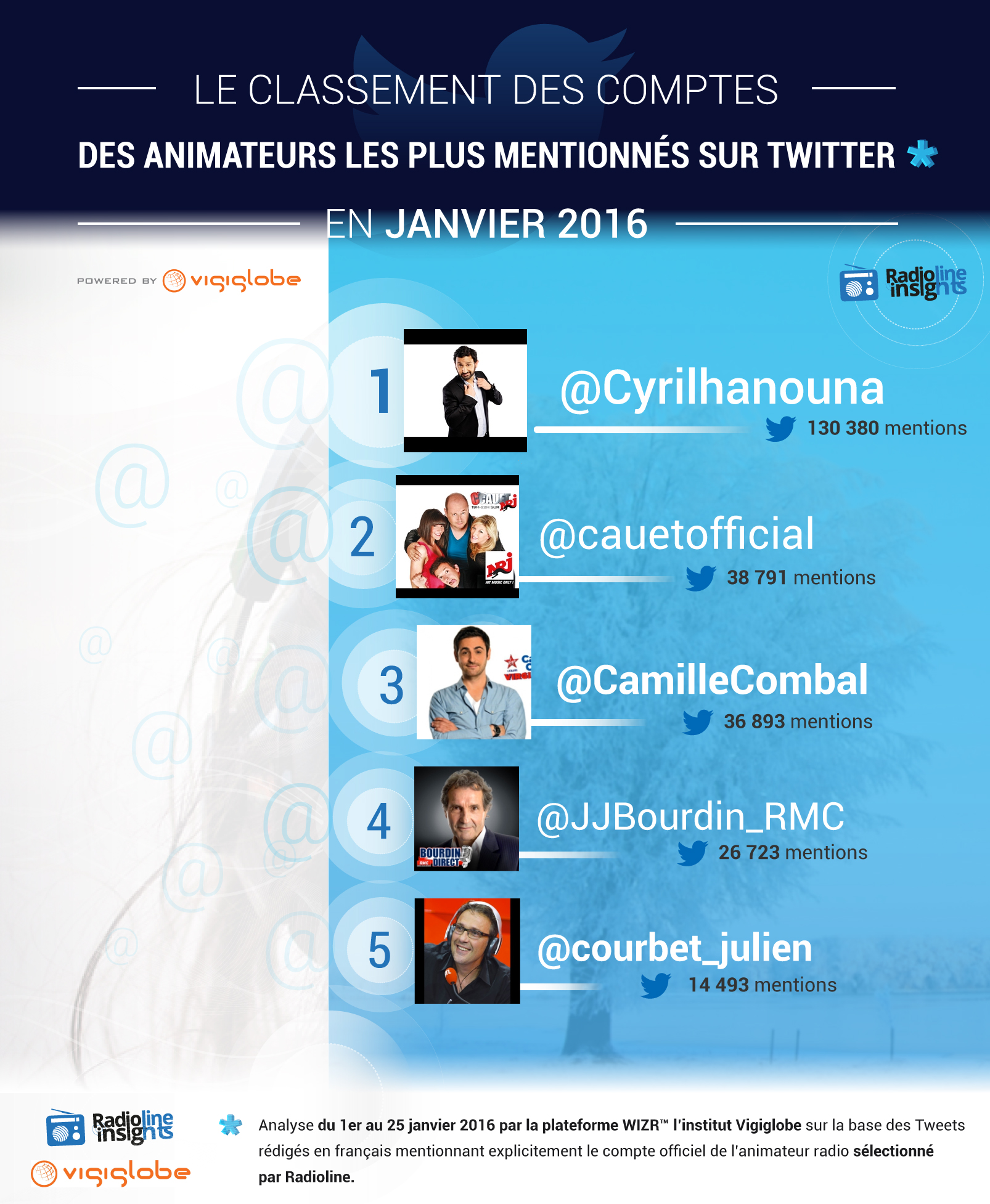 Ce classement a été établi grâce à une analyse du 1er au 25 janvier 2016 par la plateforme WIZR™ l’institut Vigiglobe sur la base des Tweets rédigés en français mentionnant explicitement le compte officiel de l’animateur radio sélectionné par Radioline.