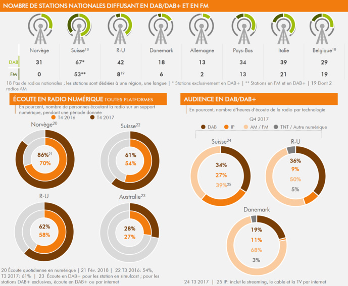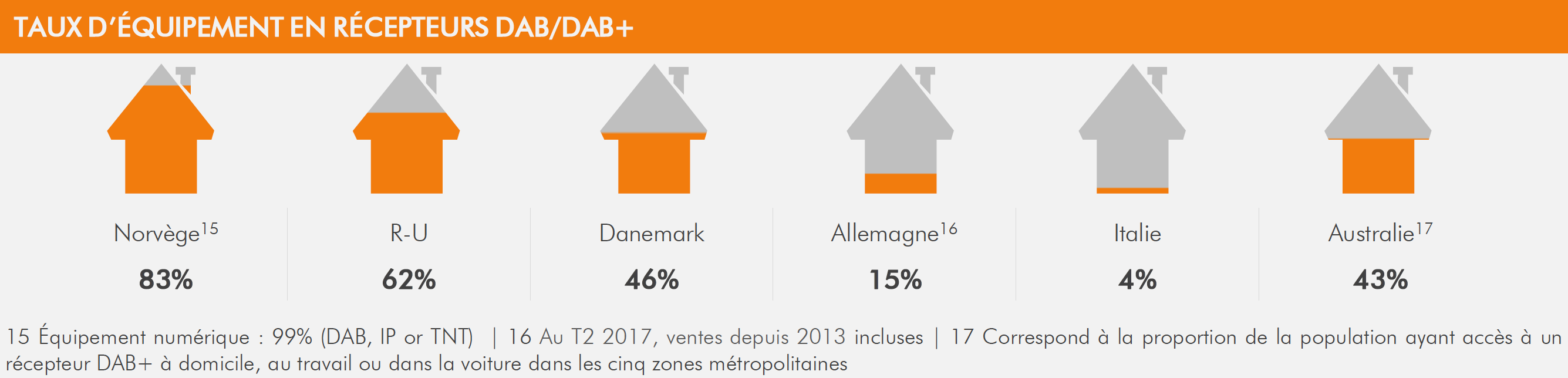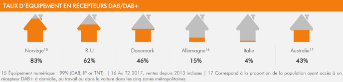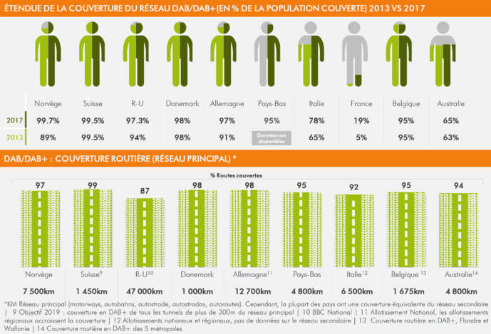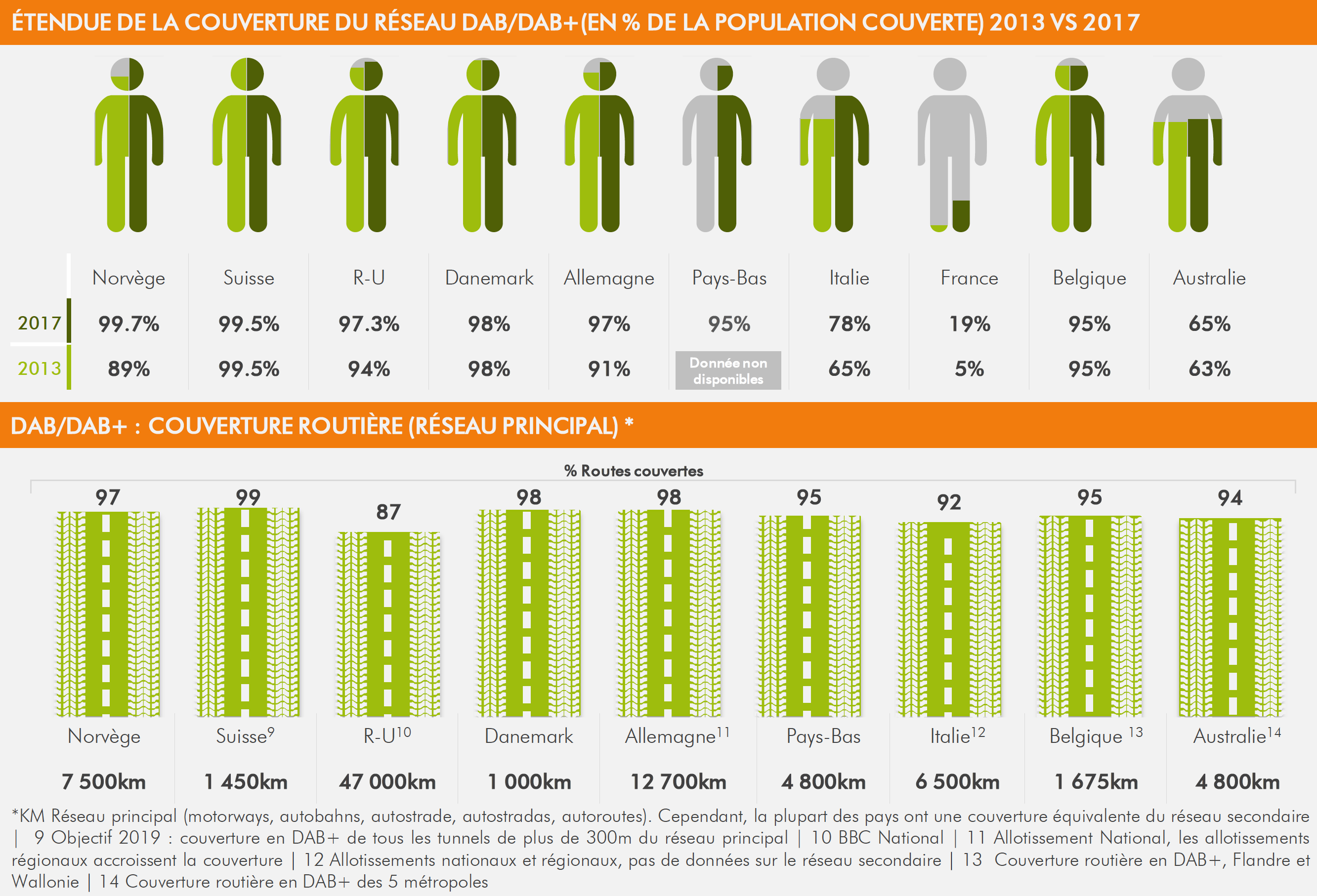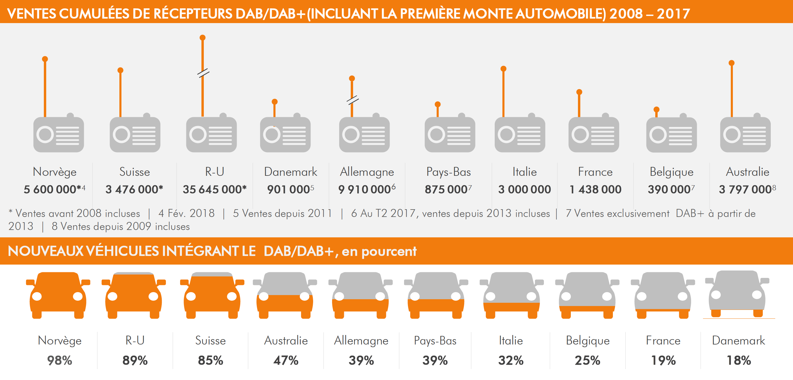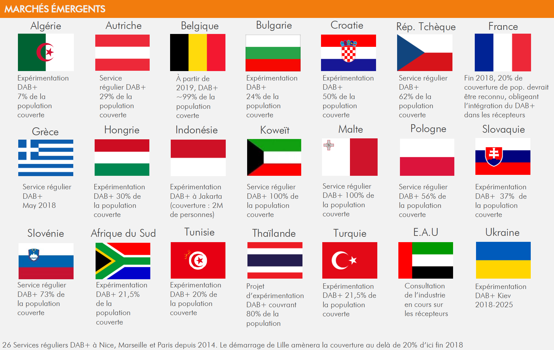 Les statistiques du DAB/DAB+ dans les pays clés et émergents pour le déploiement de la radio numérique terrestre ont été mis à jour, par pays : vente de récepteurs, couverture de la population et du réseau routier, taux d’équipement, taux d’écoute en numérique. Pour la France, les chiffres de GfK et de JATO annoncent 1.48 million de récepteurs vendus en cumulatif et une première monte à 19%. Le Royaume-Uni décompte une base installée de 36 millions de récepteurs et 89% des véhicules neufs équipés en première monte, l’Allemagne 10 millions et 39%, la Norvège 6 millions et 95%, la Suisse 3;5 millions et 85%, l’Italie 3 millions et 32% respectivement.