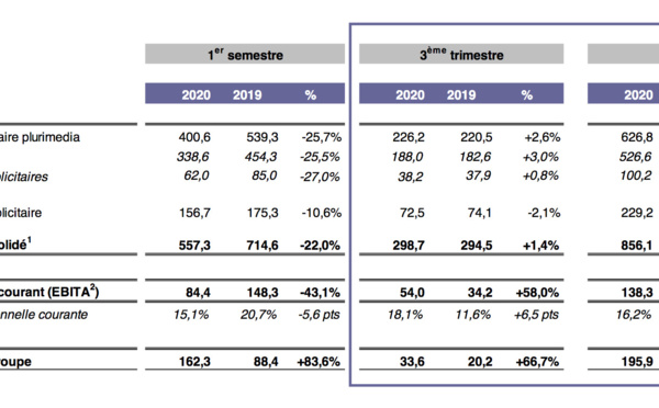 Après la fin des mesures de confinement, la consommation des ménages a observé un rebond rapide pendant la période estivale. Les activités publicitaires du groupe en ont ainsi profité et affichent une croissance de +2.6% au 3e trimestre, tirée par le média Télévision (+3,0%) qui confirme "son rôle majeur dans la relance économique".