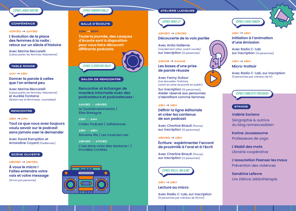 Des conférences et débats animeront de nombreux échanges et viendront répondre à une pléiade de questionnements. Le public plongera également dans l'envers du décor du podcast et sera guidé sur les règles de création, d'écriture, d'enregistrement avec des ateliers ludiques de découverte et d'initiation.