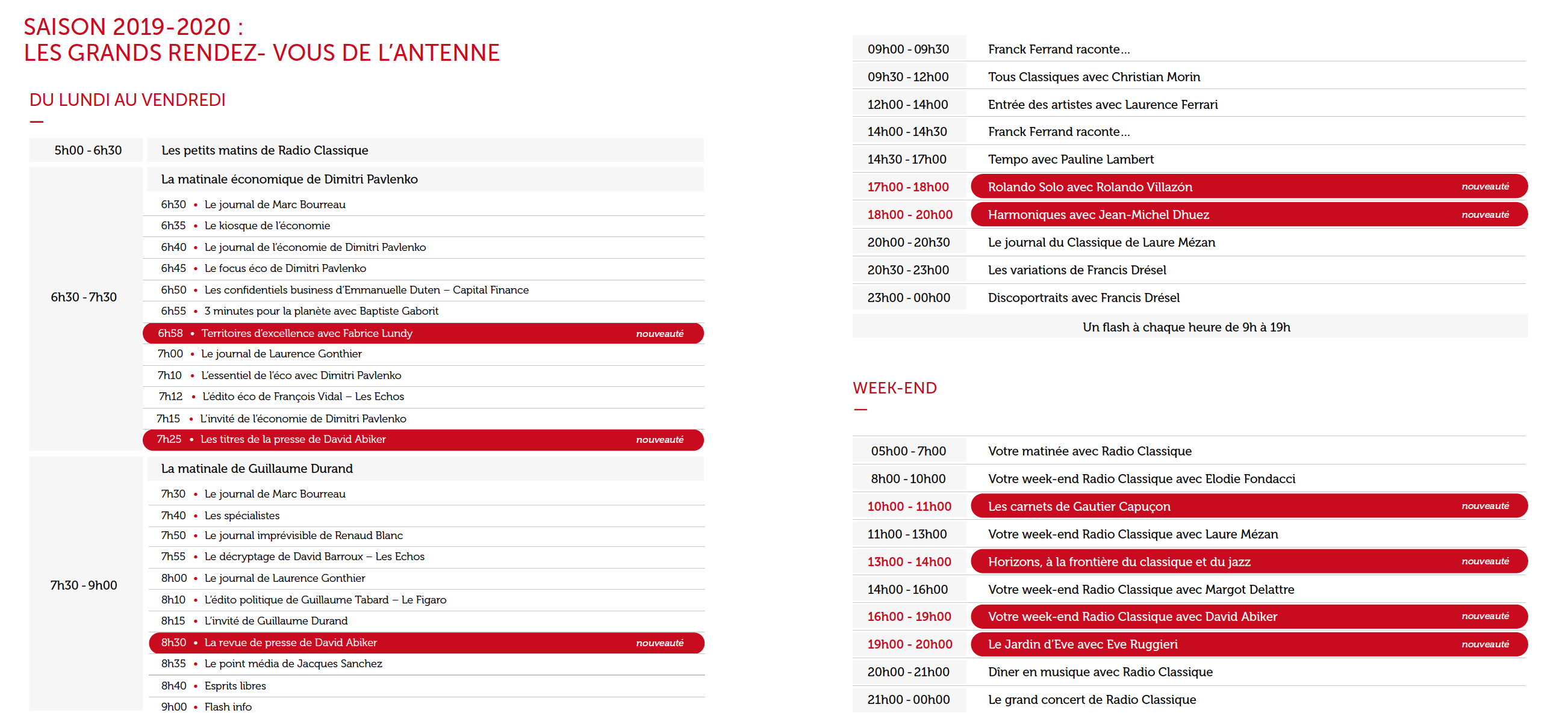 Les auditeurs retrouvent bien sûr les piliers historiques de la radio avec Franck Ferrand à 9h et 14h, Christian Morin (9h30 à 12h), Laurence Ferrari (de 12h à 14h), Pauline Lambert (de 14h30 à 17h), Jean Michel Dhuez (de 18h à 20h), Laure Mézan (de 20h à 20h30), Francis Drésel (de 20h30 à 00h) et Eve Ruggieri qui emmène désormais les auditeurs chaque samedi et dimanche à 19h dans son jardin : "Le jardin d’Eve" où elle les transporte dans l’intimité des illustres compositeurs et interprètes...