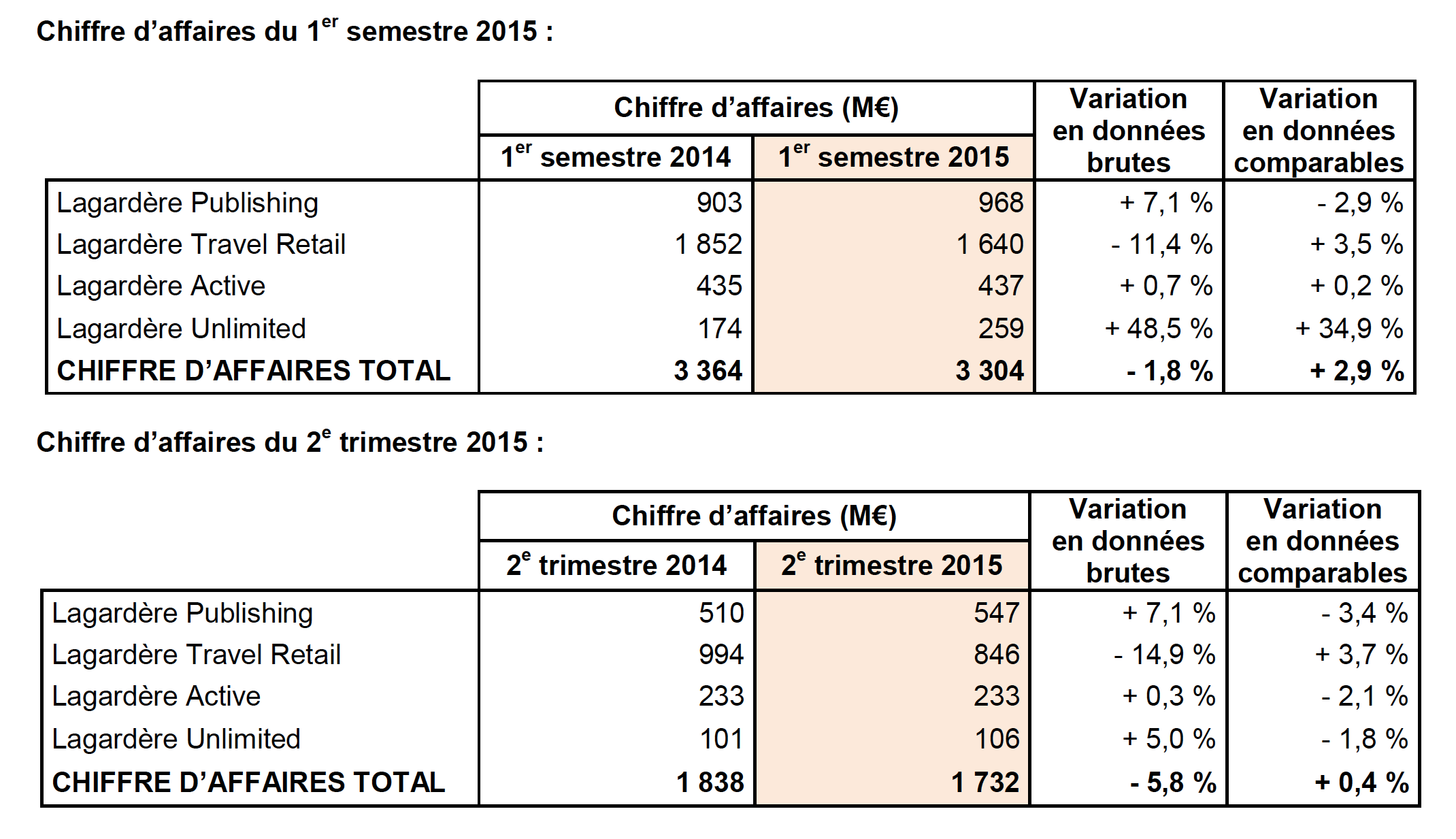 Le chiffre d’affaire de Lagardère Active, qui regroupe toute l’activité médias du groupe, est en progression de + 0,7 % en données brutes et + 0,2 % à données comparables. L’écart entre ces deux variations s’explique essentiellement par un effet de périmètre légèrement positif (+ 3 M€) : l’acquisition de Grupo Boomerang TV et l’intégration du chiffre d’affaires de Gulli compensent la cession des 10 magazines en juillet 2014.