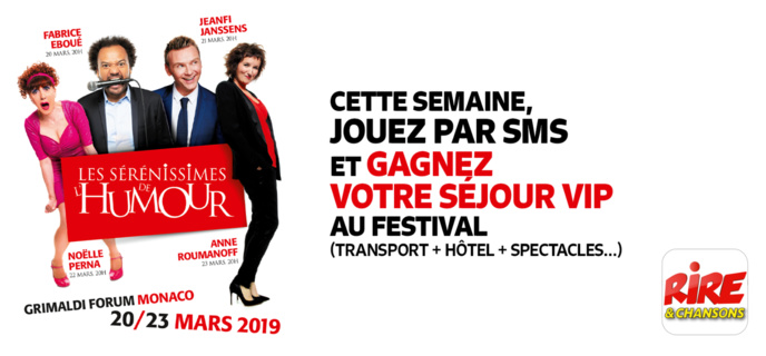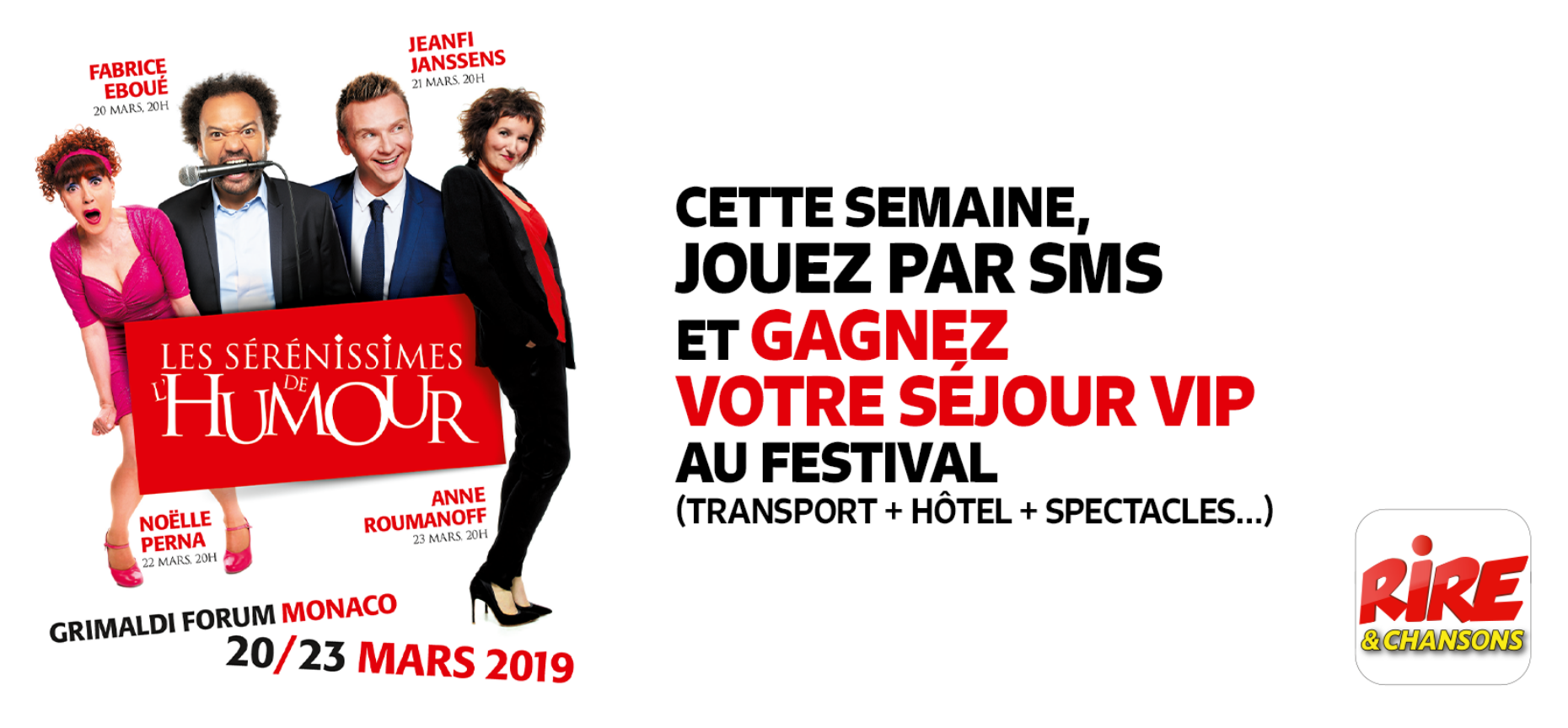 Depuis le Grimaldi Forum de Monaco, cet événement réunira Anne Roumanoff, Fabrice Eboué, Jeanfi Janssens, Noëlle Perna... Pour vivre l’événement en direct du Grimaldi Forum, chaque soir à partir de 19h, Guillaume Pot, animateur de Rire & Chansons, fera partager aux auditeurs les backstages du Festival. En direct des loges, il recueillera les impressions à chaud des humoristes avant leur montée sur scène. Ce Festival du Rire en Principauté est organisé en partenariat avec Rire & Chansons et en soutien à l’Amade Monaco.