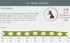 87% des Britanniques âgés de 15 ans et plus écoutent la radio chaque semaine, soit 50 millions d’auditeurs et plus d’un milliard d’heures d’écoute cumulées sur le trimestre.