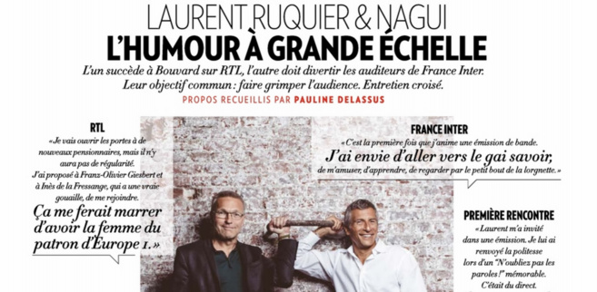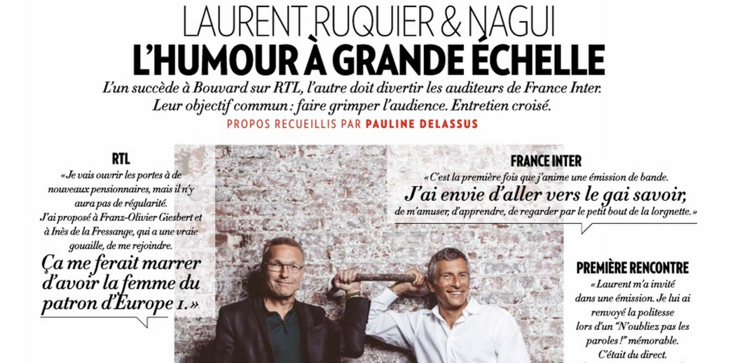 Cette semaine, Laurent Ruquier (RTL) et Nagui (France Inter) sont réunis dans l'hebdomadaire Paris Match. L'animateur de RTL indique qu'il a demandé à Inès de la Fressange (femme de Denis Olivennes, patron d'Europe 1) de rejoindre les sociétaires des Grosses Têtes. L'animateur de France Inter évoque l'avenir : "si on a un message commun, Laurent et moi, c'est que l'on n'est pas près de s'arrêter".Brulhatour est le rédacteur en chef du magazine La Lettre Pro de la Radio et le directeur associé... En savoir plus sur cet auteur