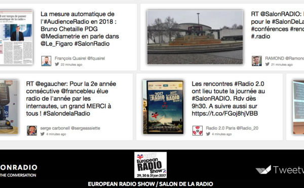 Durant toute la durée du Salon de la Radio, ne manquez aucun tweet en rapport avec cet événement annuel dédié à la radio. L'équipe a mis en place un TweetWall avec une adresse spécifique qui rassemble, en temps réel, l'ensemble des hashtags et donc, tout ce qui se dit et se dira sur cette nouvelle édition du Salon de la Radio.