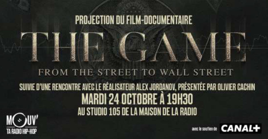 Le journaliste français, Alex Jordanov, s’est rendu aux Etats-Unis pour décrypter le phénomène Hip-Hop et ses codes, qui ont profondément changé les règles de notre société moderne. Véritable commerce planétaire, la culture Hip-Hop a su conquérir le monde pour devenir un mode de vie à part entière. De cette investigation est né le film-documentaire The Game, From the street to Wall Street, diffusé exclusivement sur Canal +. Mouv’ en organise une projection en public, au studio 105 de la Maison de la radio ce mardi 24 octobre à 19h30, présentée par Olivier Cachin. La diffusion du film se poursuivra par une rencontre avec Alex Jordanov.