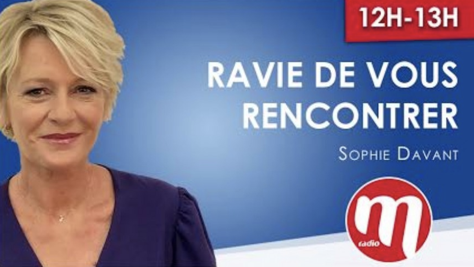 "Sophie Davant rejoint la grande équipe de M Radio pour animer une nouvelle émission hebdomadaire intitulée "Ravie de vous rencontrer". Tous les samedis, de 12 à 13h, la productrice de France 2 recevra au micro rouge une personnalité du monde de la chanson française, du cinéma ou de la télévision. L’invité réagira sur les rencontres qui ont marqué sa vie : des rencontres professionnelles aux rencontres amicales" explique la station.