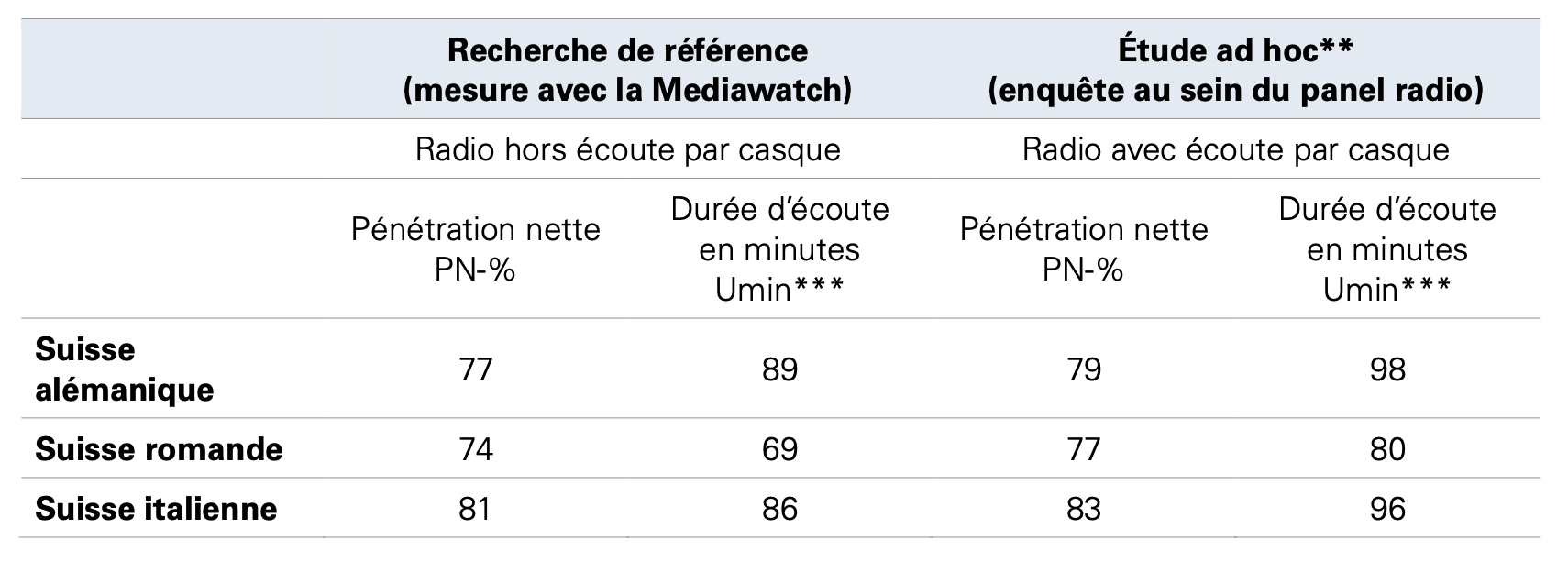 La recherche radio de Mediapulse mesure l’utilisation linéaire des programmes radio sur tous les vecteurs de diffusion analogiques et numériques. Pour des raisons techniques, elle ne tient cependant pas compte de l’audience radio résultant de l’écoute au moyen d’un casque. Grâce à une enquête complémentaire, Mediapulse a comblé cette lacune et quantifié l’écoute par casque. Compte tenu de cette écoute, il apparaît que la pénétration de la radio augmente de trois points de pourcentage en Suisse romande et de deux points de pourcentage dans chacune des deux autres régions linguistiques. Dans le même temps, la durée d’écoute quotidienne à l’échelle nationale gagne environ dix minutes. À noter que ces estimations ne valent que pour l’audience linéaire totale de la radio et ne peuvent pas être ventilées par station radio.