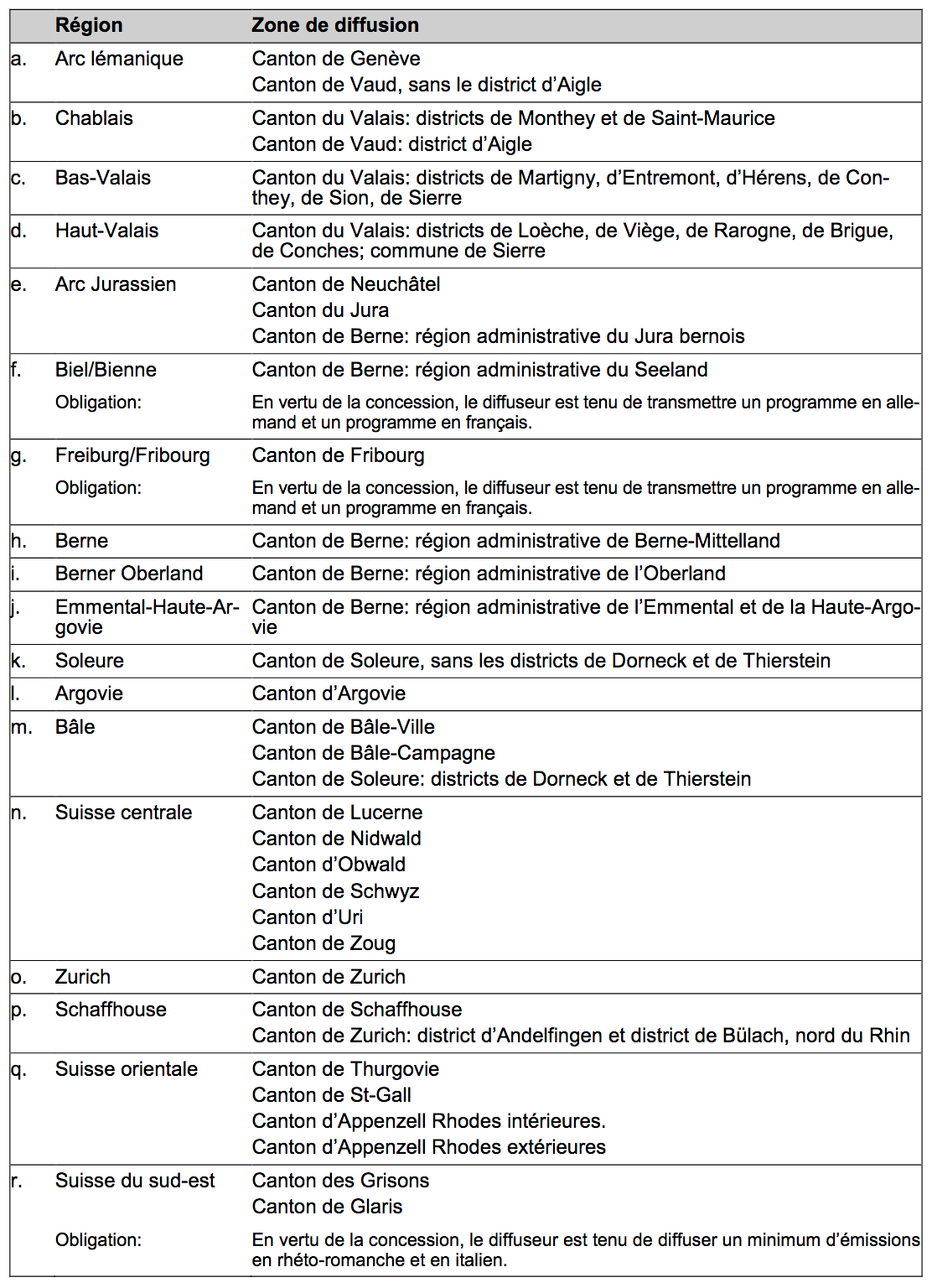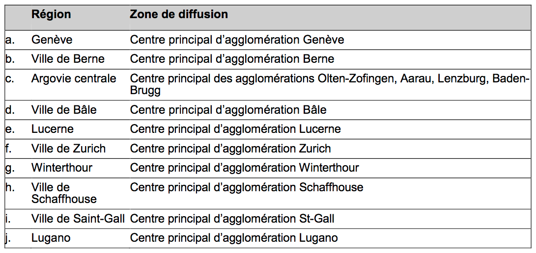 Les zones de desserte qui supposaient jusqu'ici une ou plusieurs concessions de ce type sont dorénavant définies en tant que zone de desserte avec mandat de prestations et quote-part de la redevance. Il s'agit des zones Arc Lémanique (4 concessions), Berne (2), Soleure-Olten (1), Argovie (1), Bâle (2), Suisse centrale (3), Zurich (5) et Suisse orientale (2). Pour ces zones, le Conseil fédéral prévoit désormais une concession spécifique (voir fiche d'information). Comme pour la télévision régionale, le public disposera sur tout le territoire d'informations régionales, ce pour quoi les diffuseurs recevront une quote-part de la redevance de radio-télévision.