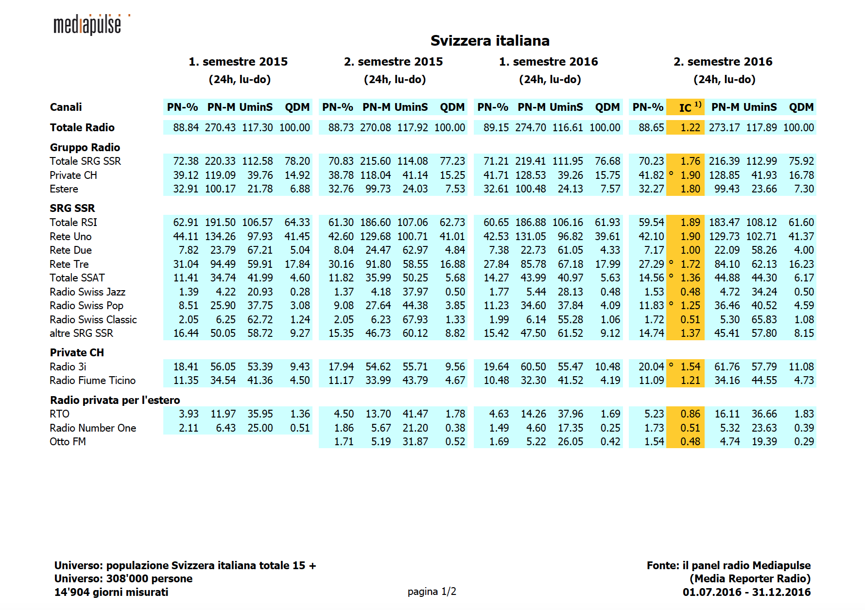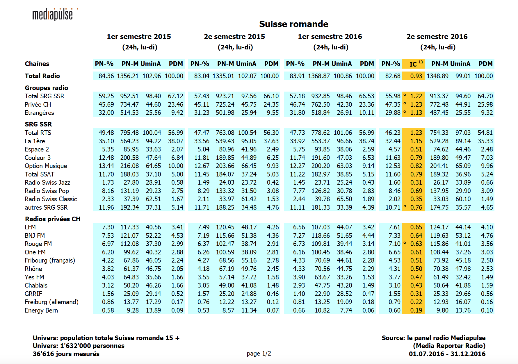 Au 2e semestre 2016, le média radio a su résister à la haute pression concurrentielle des autres médias et jouit toujours des faveurs de la population suisse âgée de 15 ans et plus. Tous les jours, 82,7% des Suisses romands laissent la radio allumée pendant 99 minutes environ. En Suisse alémanique, ce sont 86,7% pour 115 minutes d’audience et en Suisse italienne 88,7% pour un score encore élevé de 118 minutes par auditeur et par jour.