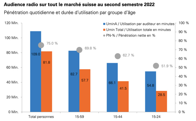 Au second semestre 2022, les offres linéaires des stations radio privées et publiques ont atteint quotidiennement 75% de la population suisse à partir de 15 ans (environ 5.4 millions de personnes). Cela signifie qu’en Suisse, trois adultes sur quatre écoutent chaque jour la radio. Si l’on compare les données des différentes régions linguistiques, la Suisse italienne vient en tête, avec une pénétration de 81%, suivie de la Suisse alémanique avec 76 % et de la Suisse romande avec 71 %. Celles et ceux qui écoutent la radio linéaire le font pendant 109 minutes par jour en moyenne. Les auditrices et auditeurs les plus assidus sont les Suisses alémaniques, avec une durée d’écoute quotidienne de 114 minutes, tandis que les Suisses romands se contentent de 92 minutes.