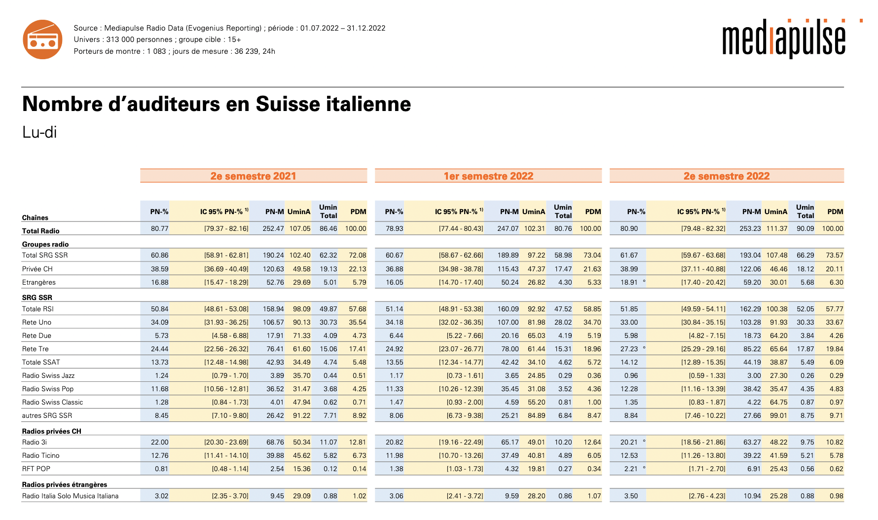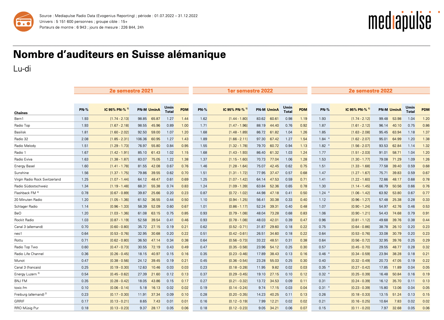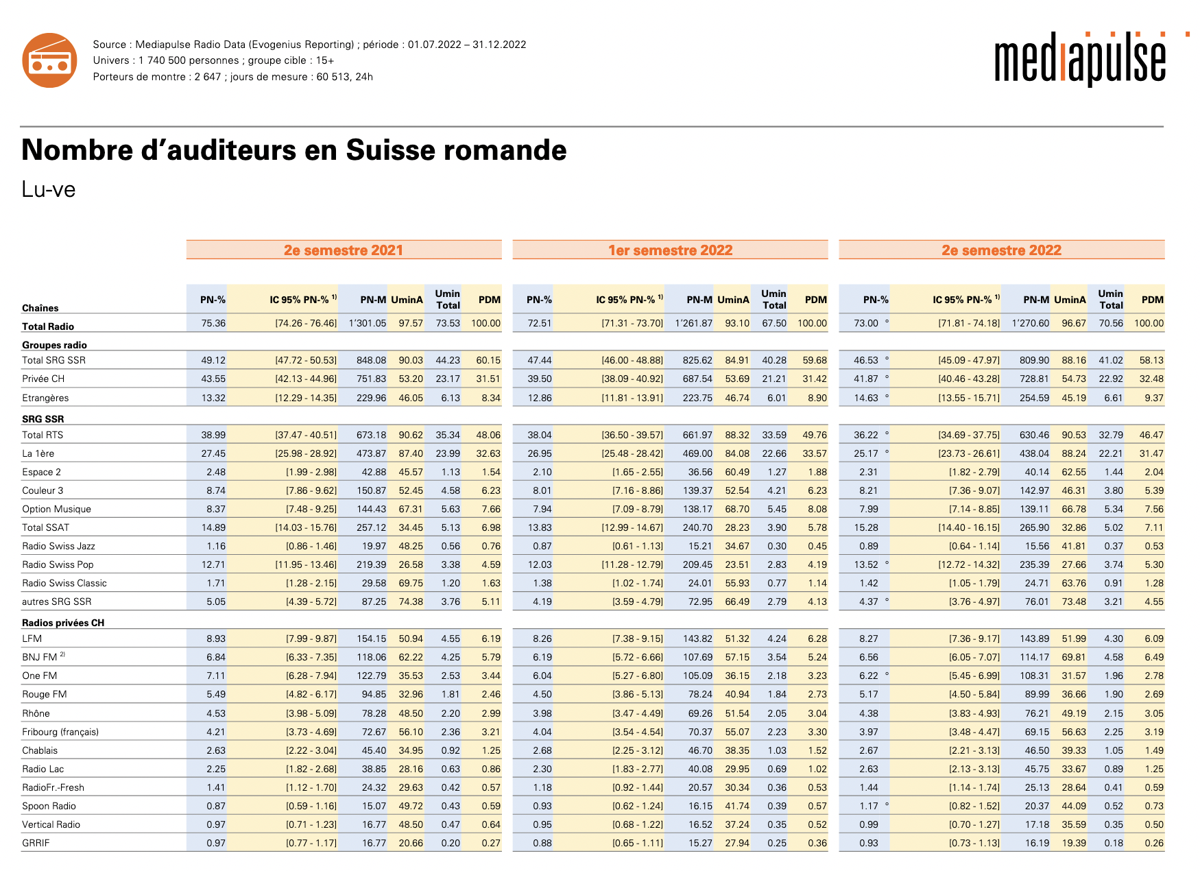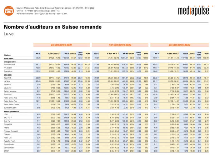 Comme chaque semestre, Mediapulse publie les principales données d’audience radio en Suisse. Présentées sous forme agrégée, ces données livrent une vue d’ensemble de l’utilisation du média radio dans tout le pays. Jusqu’au premier semestre 2022, Mediapulse présentait les données radio et TV dans une publication semestrielle commune. À partir de la présente publication relative au second semestre 2022, les chiffres semestriels de chaque média sont publiés séparément et successivement, en commençant par ceux de l’audience radio, suivis de ceux de l’audience TV, puis de l’audience en ligne.