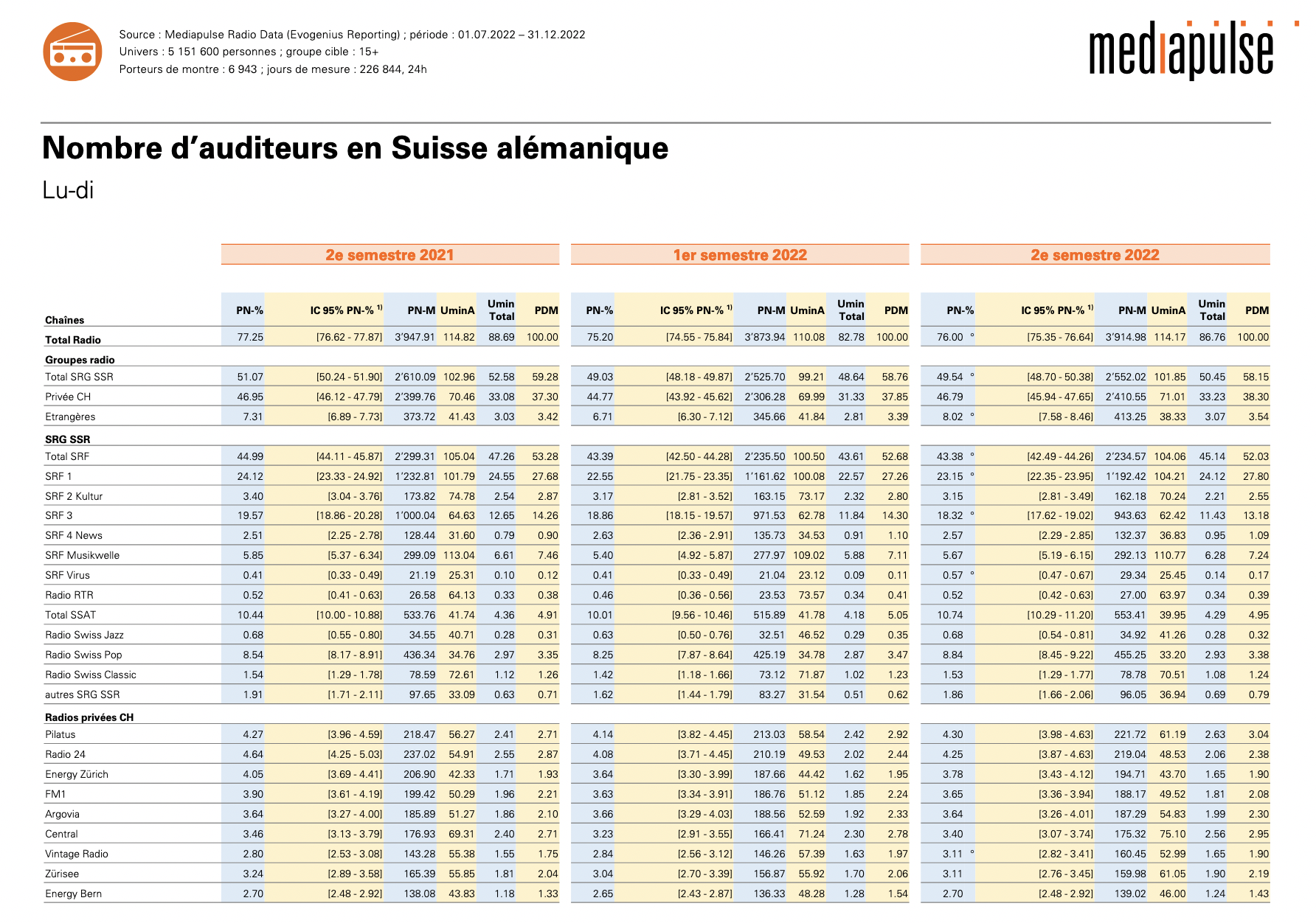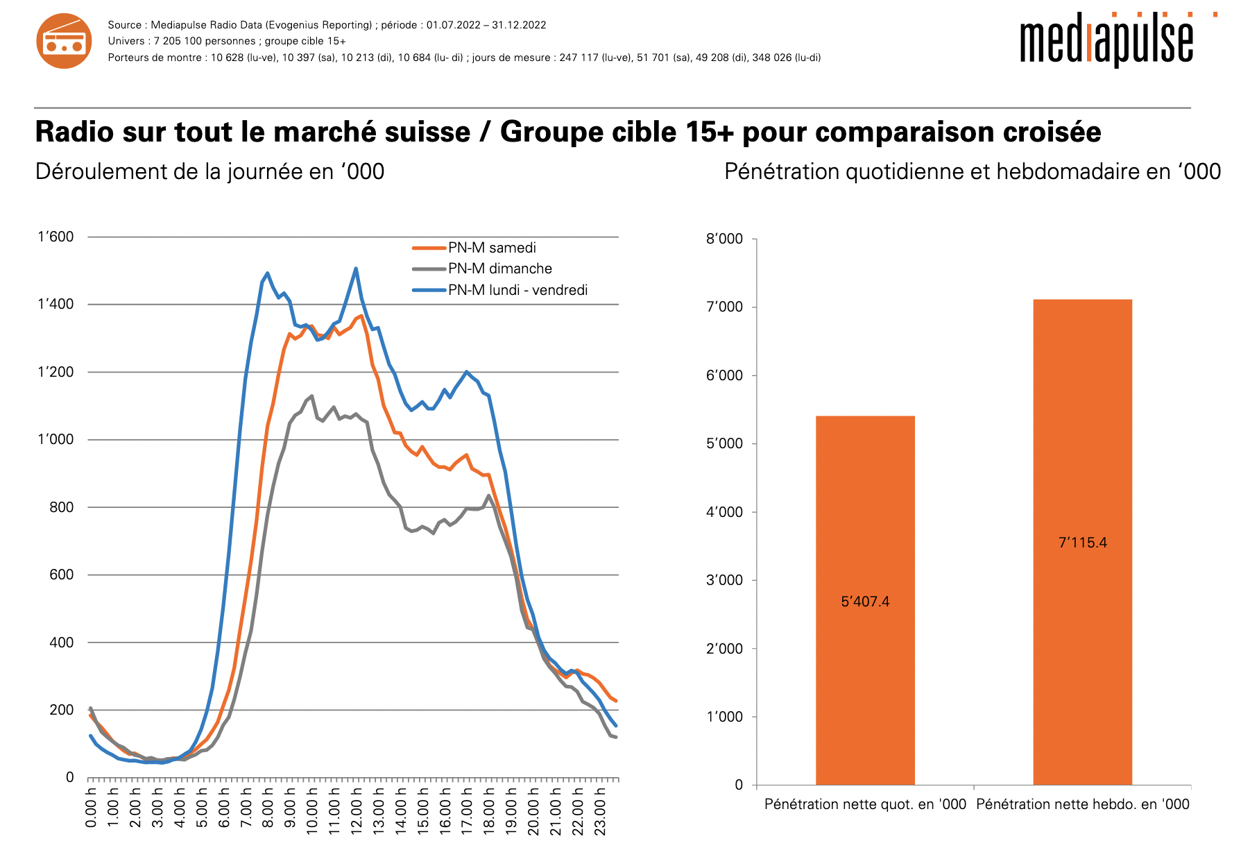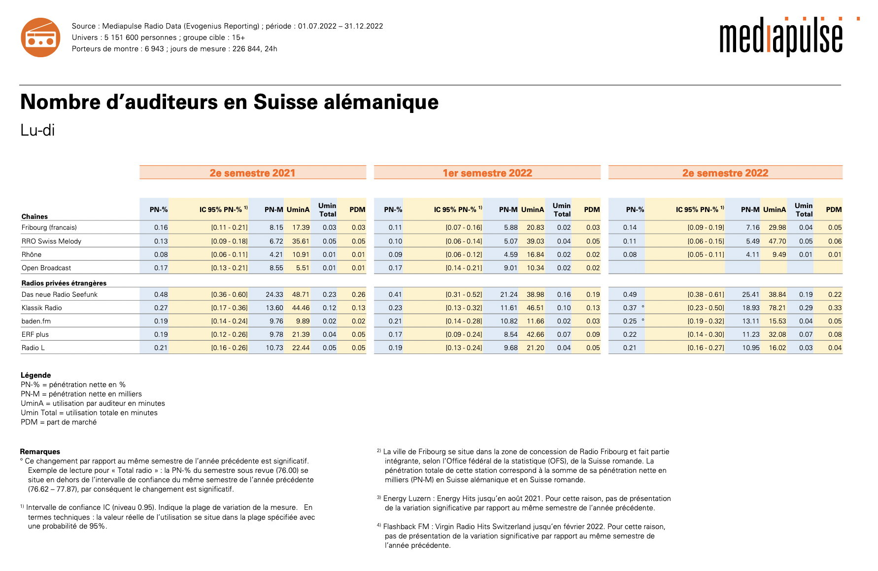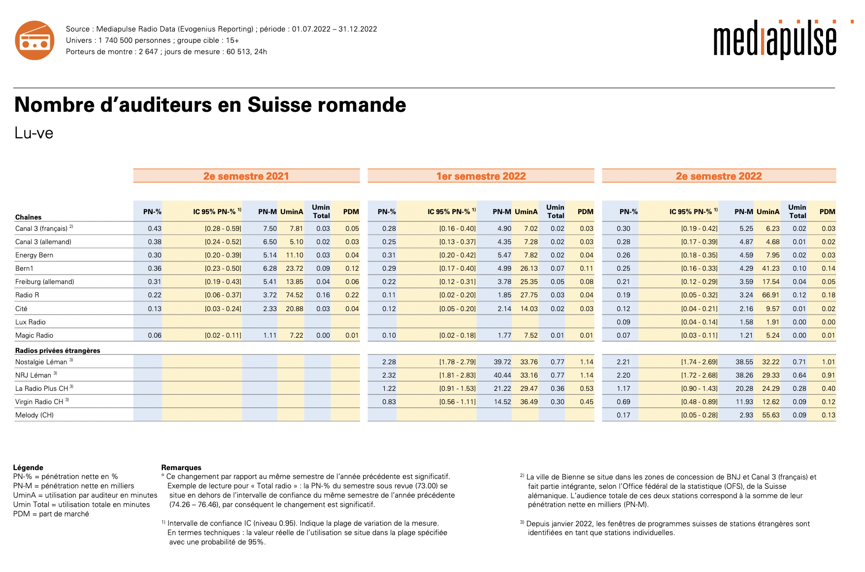 Comme chaque semestre, Mediapulse publie les principales données d’audience radio en Suisse. Présentées sous forme agrégée, ces données livrent une vue d’ensemble de l’utilisation du média radio dans tout le pays. Jusqu’au premier semestre 2022, Mediapulse présentait les données radio et TV dans une publication semestrielle commune. À partir de la présente publication relative au second semestre 2022, les chiffres semestriels de chaque média sont publiés séparément et successivement, en commençant par ceux de l’audience radio, suivis de ceux de l’audience TV, puis de l’audience en ligne.